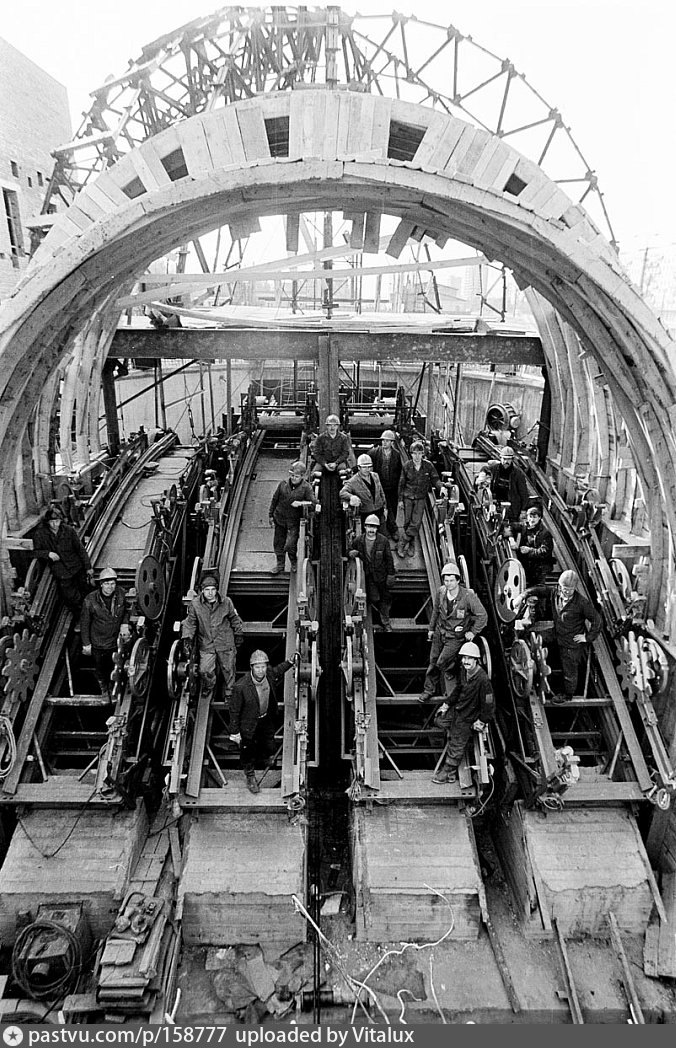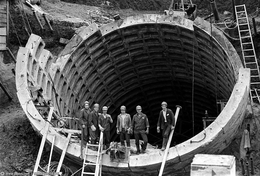 Метростроители у наклонного хода станции "Красногвардейская", 1979.