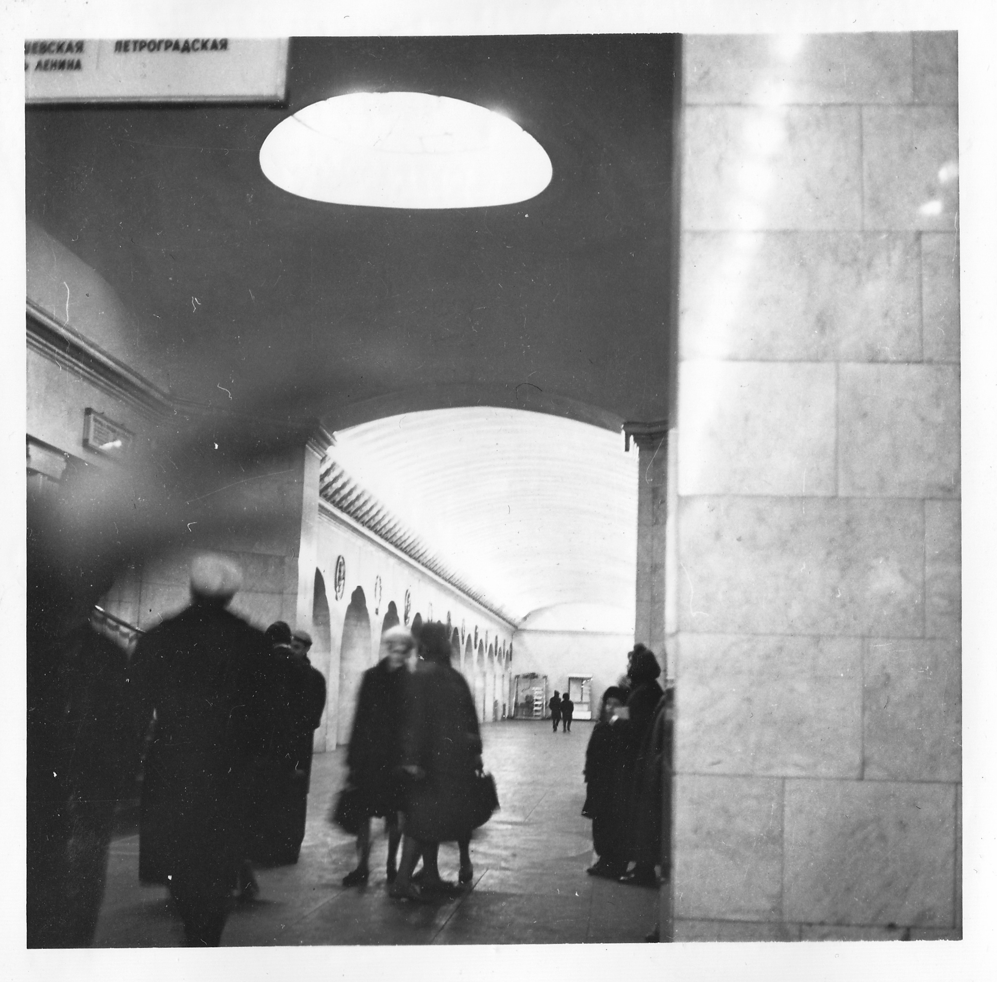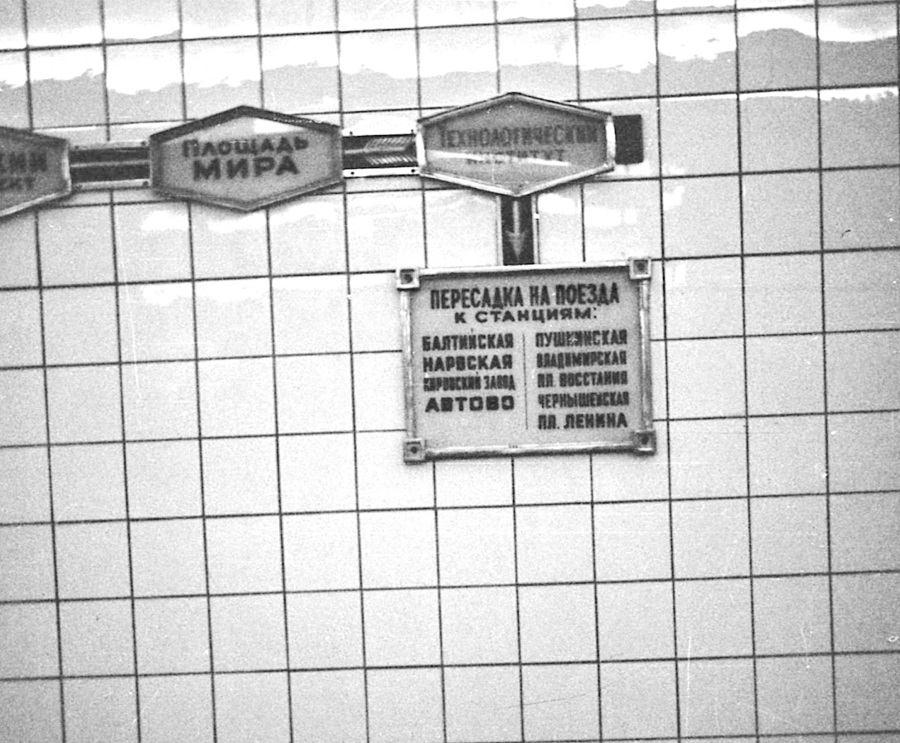 Схема линий Ленинградского метрополитена на стене перехода между станциями «Технологический институт». Нереализованный проект многоэтажного дома над вестибюлем «Василеостровской», работающая станция «Дачное» и обозначенная, но ещё не действующая станция «Завод „Большевик“». Автор фото Владимир Целик, 27 марта 1973 года.