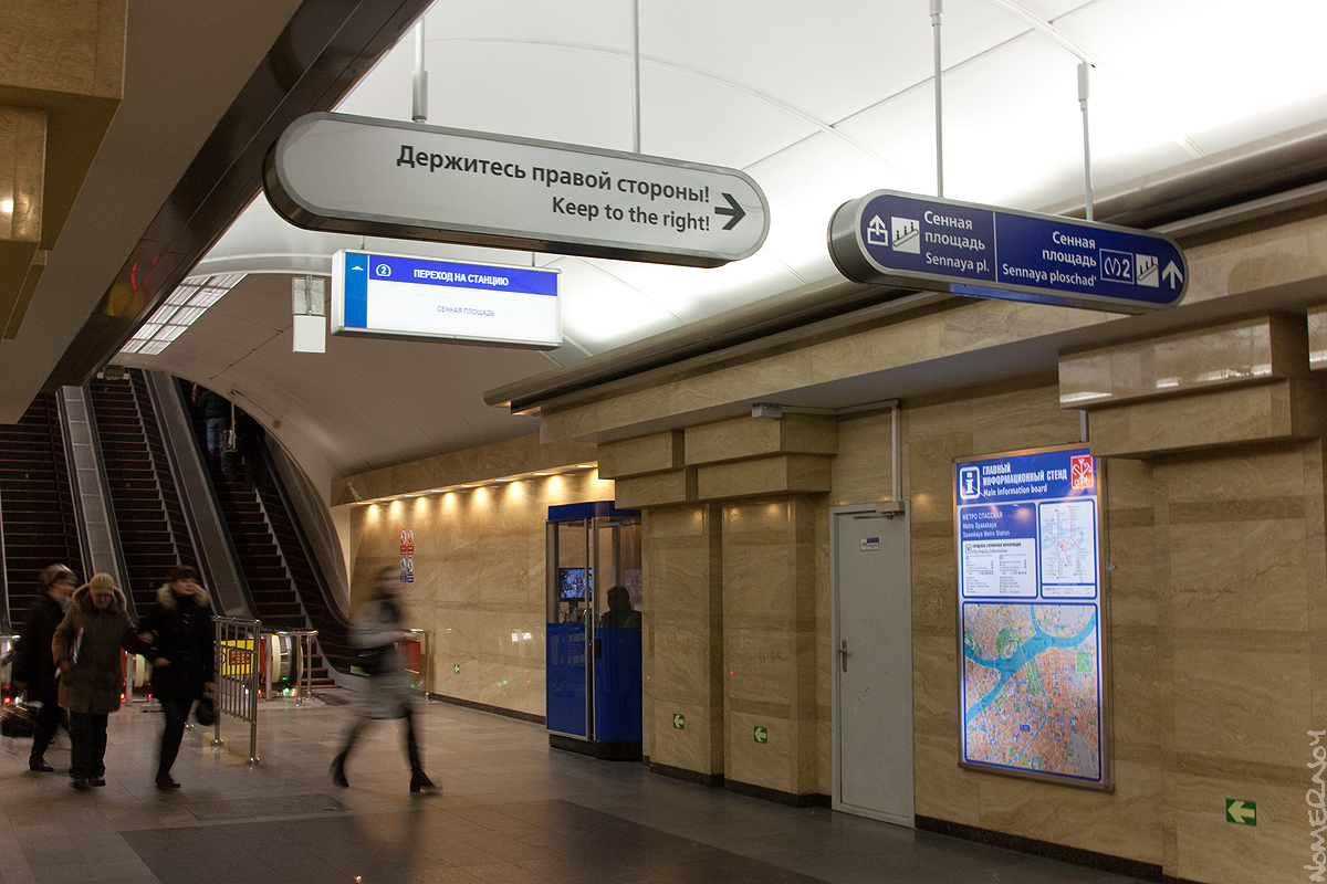 А я вот сначала даже не понял, в чём весь идиотизм бокса с повторенной дважды Сенной площадью. А потом меня осенило: "Сенная площадь" выходит прямиком на Сенную площадь! Ну кто бы мог подумать! А как было хорошо, просто и понятно: "Переход на станцию Сенная площадь".