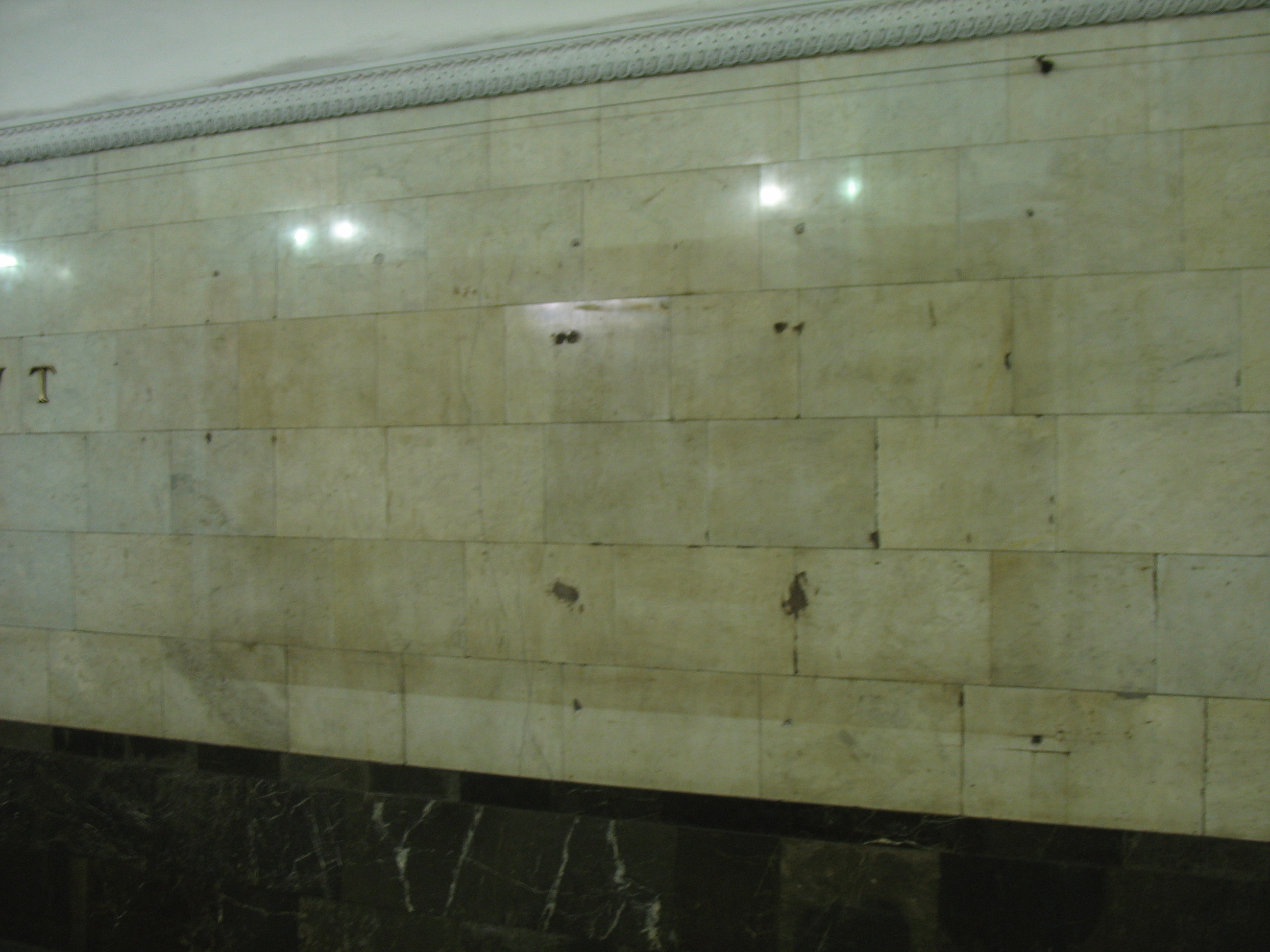 Стена и без полосы изуродована отверстиями от рекламных щитов... Ну ладно, на экскалаторах, ладно, в вагонах, но зачем скрывать мрамор под огромными щитами??? Да и полоса будет тут совсем "в тему"... В общем, изуродовать решили всё... И притом, очень основательно!!!