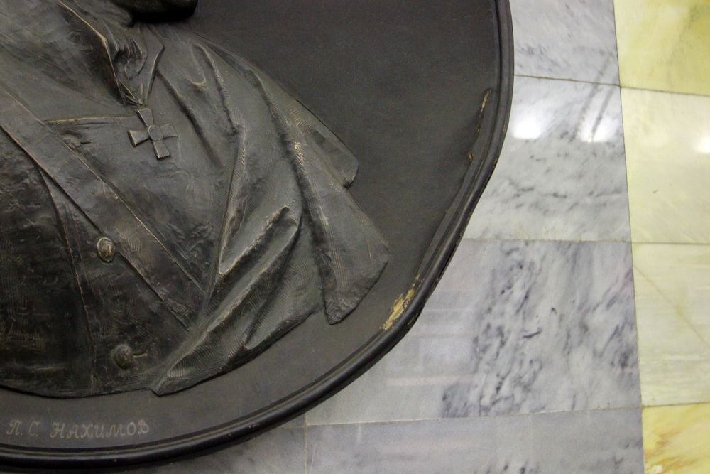 Поврежденный барельеф с изображением адмирала Нахимова, расположенный в подземном зале станции метро «Адмиралтейская», будет заменен. По мнению чиновников, его невозможно восстановить.