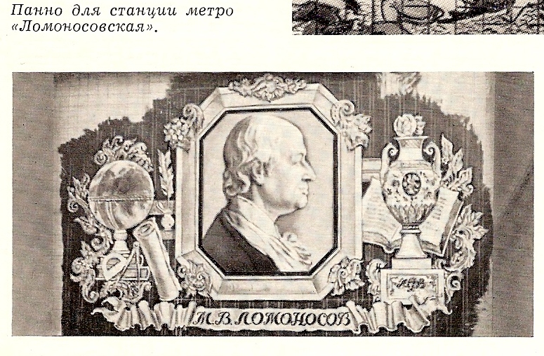 Было решено разместить в торце новое изображение Ломоносова. Так, в статье "Монументальная пропаганда в ансамблях метрополитена" (статья второй половины 1970-х, целиком здесь: viewtopic.php?f=27&t=5384 ) фигурирует проект панно из фарфора (илл.2). Произвести панно планировалось на Ленинградском фарфоровом заводе имени М.В. Ломоносова, от которого станция получила имя. Автором этого проекта был заслуженный художник РСФСР В.М. Городецкий, который создавал для завода эскизы фарфоровых ваз, блюд и т.п. Этому проекту не суждено было воплотиться. Торцовая стена оставалась неоформленной.