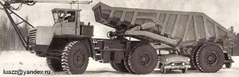 И ещё забавная фотка с комментариями: "Первый отечественный дизель-троллейвоз был построен в 1964 году на Белорусском автозаводе. Самосвальный автопоезд, который приводился в действие, как от дизельного двигателя, так и от электромоторов, получил индекс БелАЗ-7524-792 и обладал грузоподъемностью в 65 т.