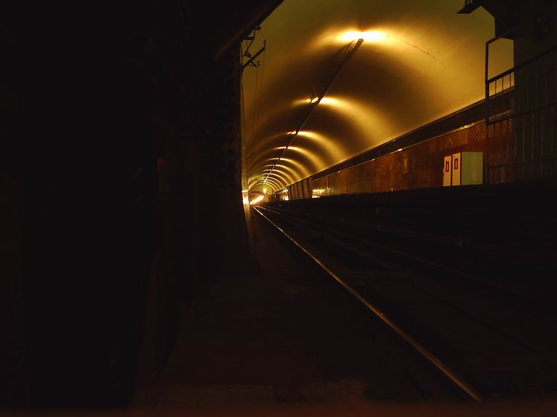 Именно что ничего не видно! Я уже давно брежу такими видами: темный односвод, страшно, свет идет только от освещения в поездах. Мне рассказывал друг, что как-то раз он оказался на ст. м. "Лиговский проспект" в полной темноте, причем, как мы знаем, освещения от наклонного хода на той станции не видно... Говорит, даже когда поездов не было, освещение шло из тоннелей, от фар поездов, которые были в тоннелях. Обычно поезд из-за нескольких поворотов не видно, но когда полная темнота, то это становится существенным... Не знаю, может быть, со вспышкой что-нибудь и сфотографировалось бы.