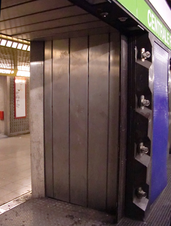 В Миланском метрополитене на новых станциях есть вот такая система пожаротушения- дренчеры в пилонах, у выхода на платформу.