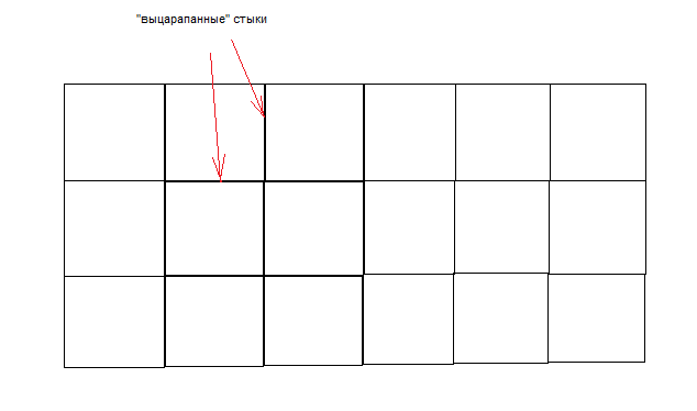 Мне почему-то кажется, что хотят внести разнообразие в унылый внешний вид стены - решили выделить некоторые секции, выцарапав замазку из стыков. Потому что замазка случайно выпасть из швов - пусть с небольшой, но закономерностью - просто так не может... (Правда, я пока не считал специально - на одинаковом ли расстоянии находятся эти группы секций). Но попутно отломались углы плитки (во качество!!!).