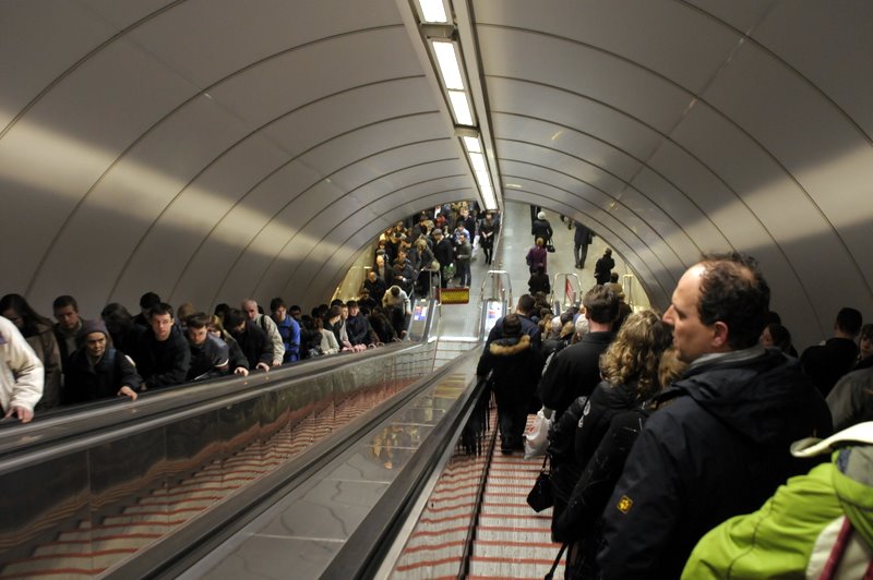 Все эти проекты по переустановке лестниц пусть даже на 3 нитки грешат одним - это слишком долго. Обычные лестничные марши не под каким видом не допустят, разве что оставить пару эскалаторов на подъём, а на спуск сделать обычные ступени. Хотя вряд ли конструкция тоннеля позволит, ведь по-любому пришлось бы делать небольшие площадки между маршами.
