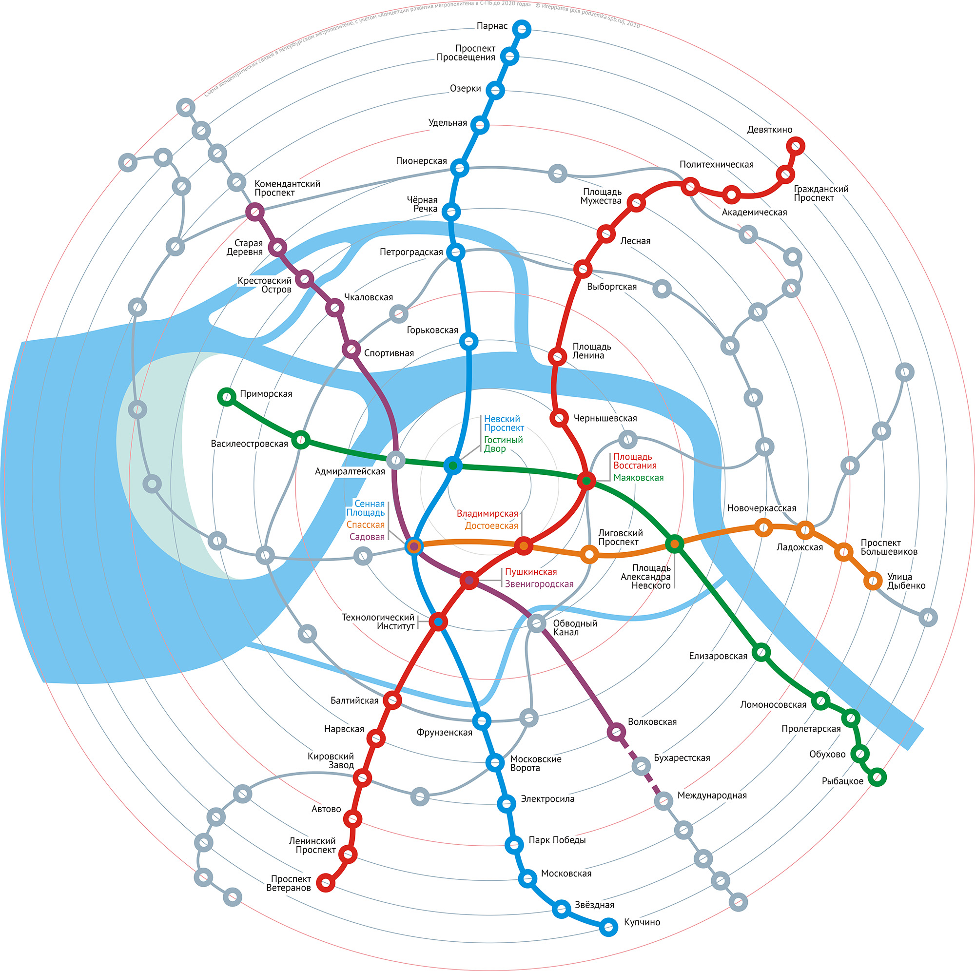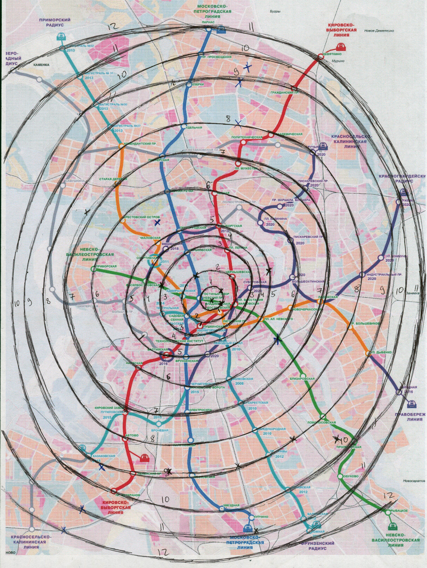 Зато появляется возможность определить тяготение станций к тем или иным дугам и, исходя из расположения сетки улиц, уточнить их размещение на схеме. Так, например, можно сместить наружу станции «Политехническая» и «Академическая»; определить тяготение «Елизаровской» к внутреннему кольцу; «вернуть на место» «Купчино» и «Обухово»; ввести дополнительное кольцо, на котором расположены Владимирская площадь, выходы «Маяковской» и «Гостинного Двора», упоминавшаяся в старых планах станция на углу Литейного проспекта и улицы Некрасова.