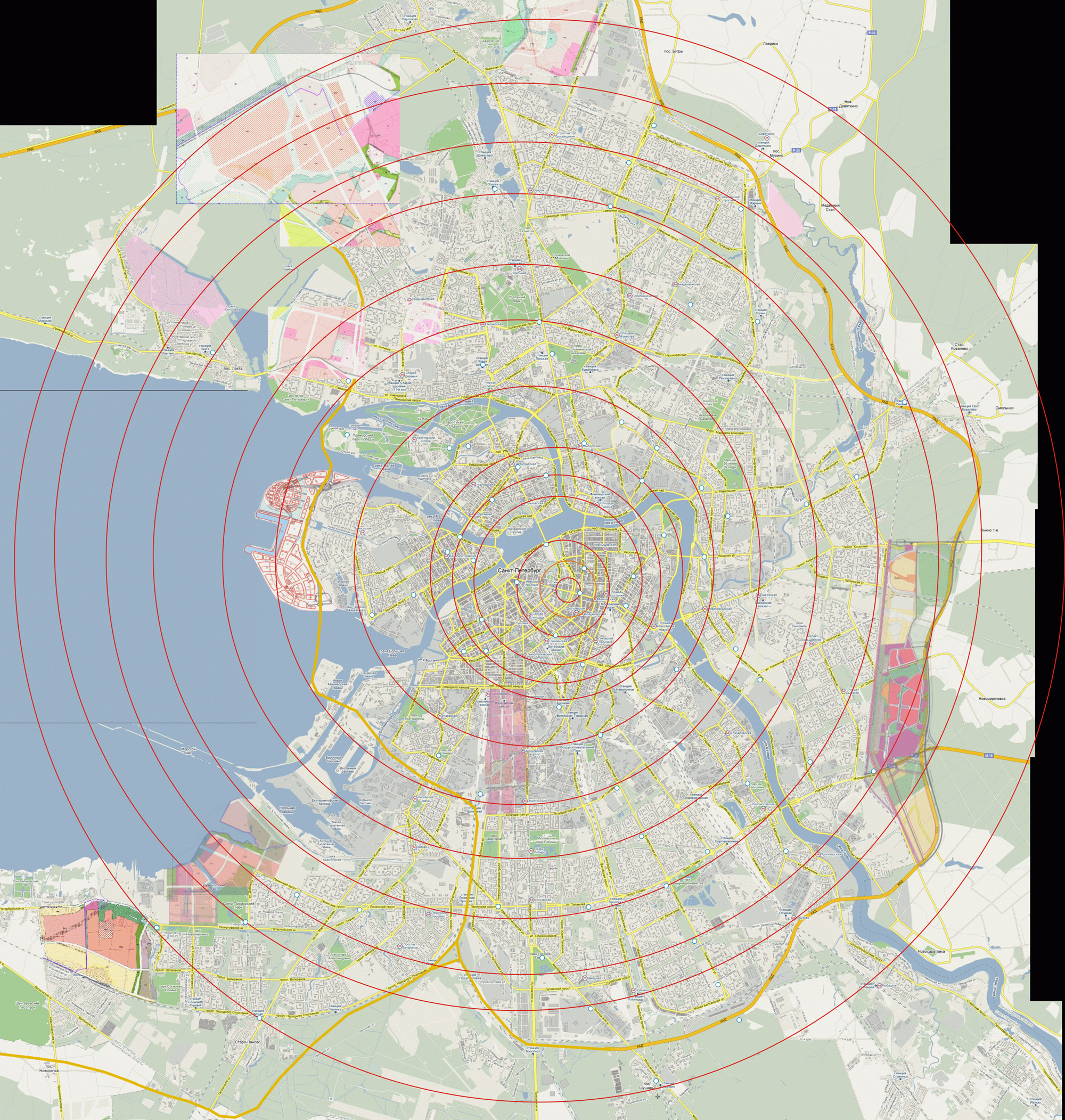 Следующий шаг — переход со схемы на карту города. В качестве подосновы берём склейку камрада Антонио, на которой дополнительно отмечаются свежеоткрытые и некоторые из планируемых и планировавшихся станций. Вообще, тут тоже стоило строить эллипсы, а не кольца. Но так как основные связи — горизонтальные, то на результат это значительного влияния не оказывает.