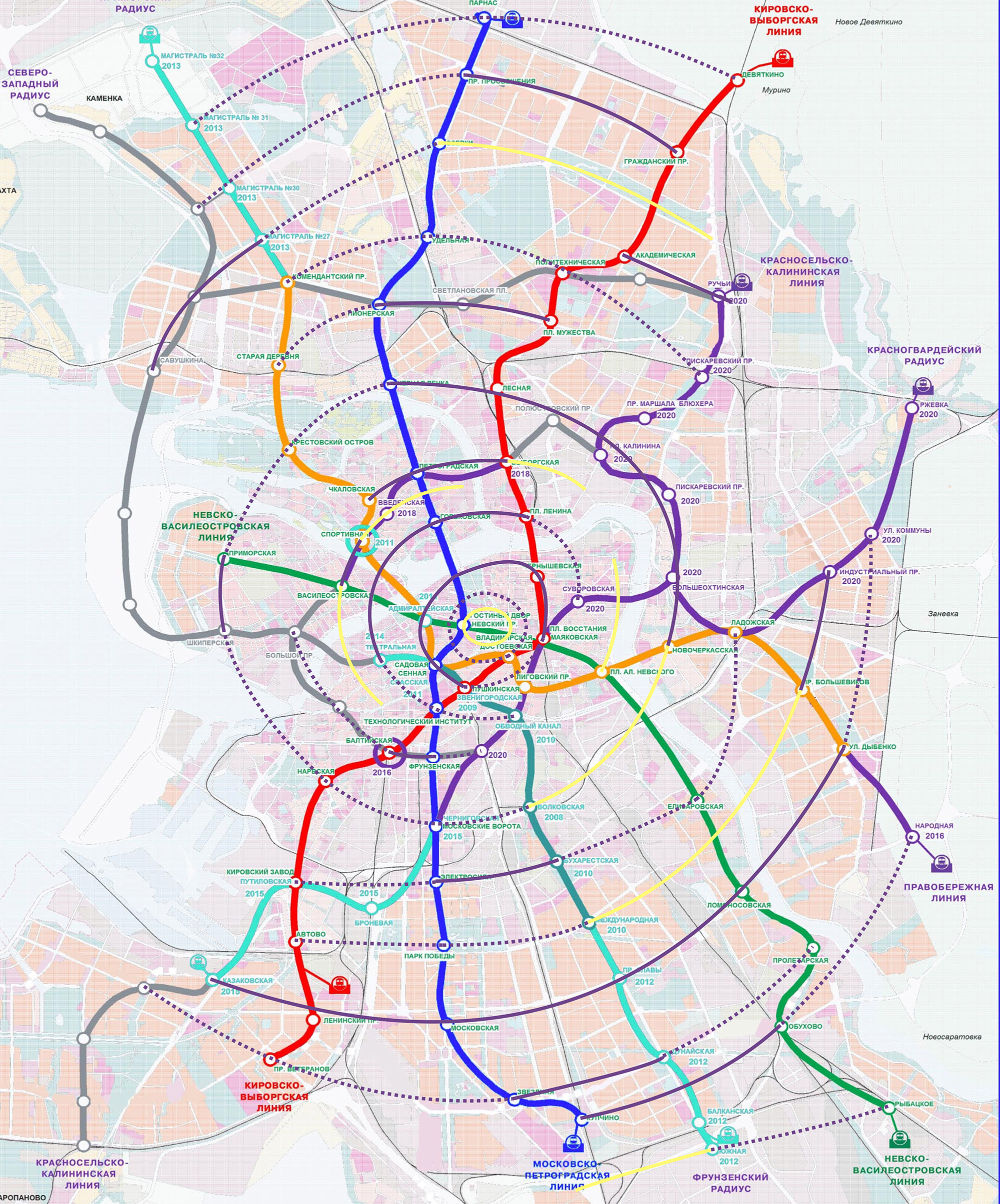 Итак, для начала берём официальную схему развития метрополитена до 2020 года и строим на ней кольца-связки. Хорошо видно, что в меридиональном направлении связи почти отсутствуют. Первые из построенных колец — в центре, насыщенные станциями второе («Адмиралтейская», Сенная площадь, «Звенигородская», площадь Восстания, «Чернышевская», предполагавшаяся станция на Марсовом поле) и пятое («Выборгская», «Петроградская», «Чкаловская», «Большой Проспект», площадь Репина, «Балтийская», «Фрунзенская», «Боровая», «ПлАН», планировавшиеся станции возле Смольного и ЛМЗ). Внешняя половина колец довольно очевидна, особенно на юге города. Отдельно стоит упомянуть кольцо вдоль центральной дуговой магистрали.
