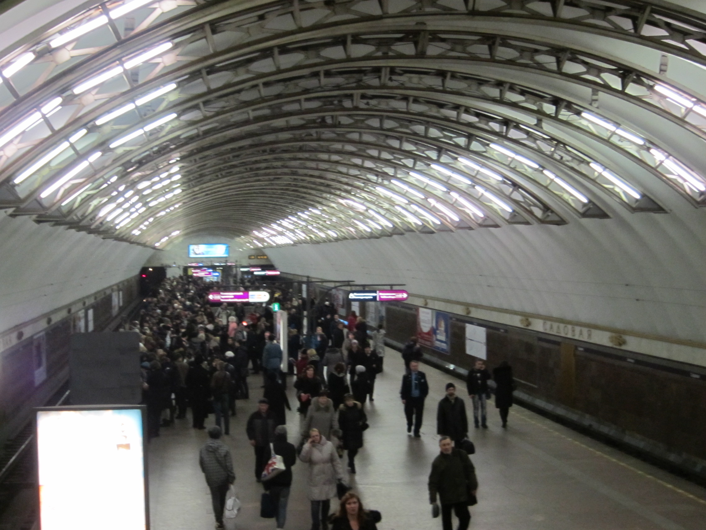 в 16-40 я поднялся на садовую и увидел гораздо больше народа на платформе по 1-му пути, чем обычно. сначала подумал, что просто поезд ушёл в депо, поэтому народу скопилось много, но отключённые интервальные часы в сторону звенигородской какбе намекнули, что дело серьёзное. интервалы были очень большие, а подъезжающие поезда выезжали и отправлялись медленно. потом по громкой связи объявили, что движение по ФПЛ приостановлено и посоветовали пользоваться МПЛ и ПЛ, народ, к слову, активно пользовался этим советом, поэтому серьёзной давки не было. Я никуда не торопился и решил запечатлеть на память толпу на садовой. фото прилагаю.
