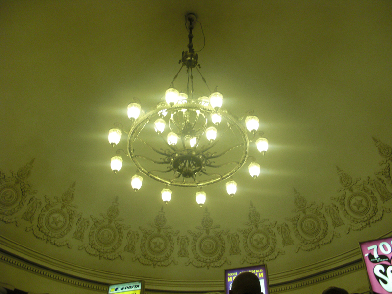 Не могу не заметить, что и Киевскую (все Киевские) затронула бессистемная замена/удаление элементов убранства. Во иллюстрацию - та же люстра, где в верхнем ряду поставлен совершенно левый плафон.