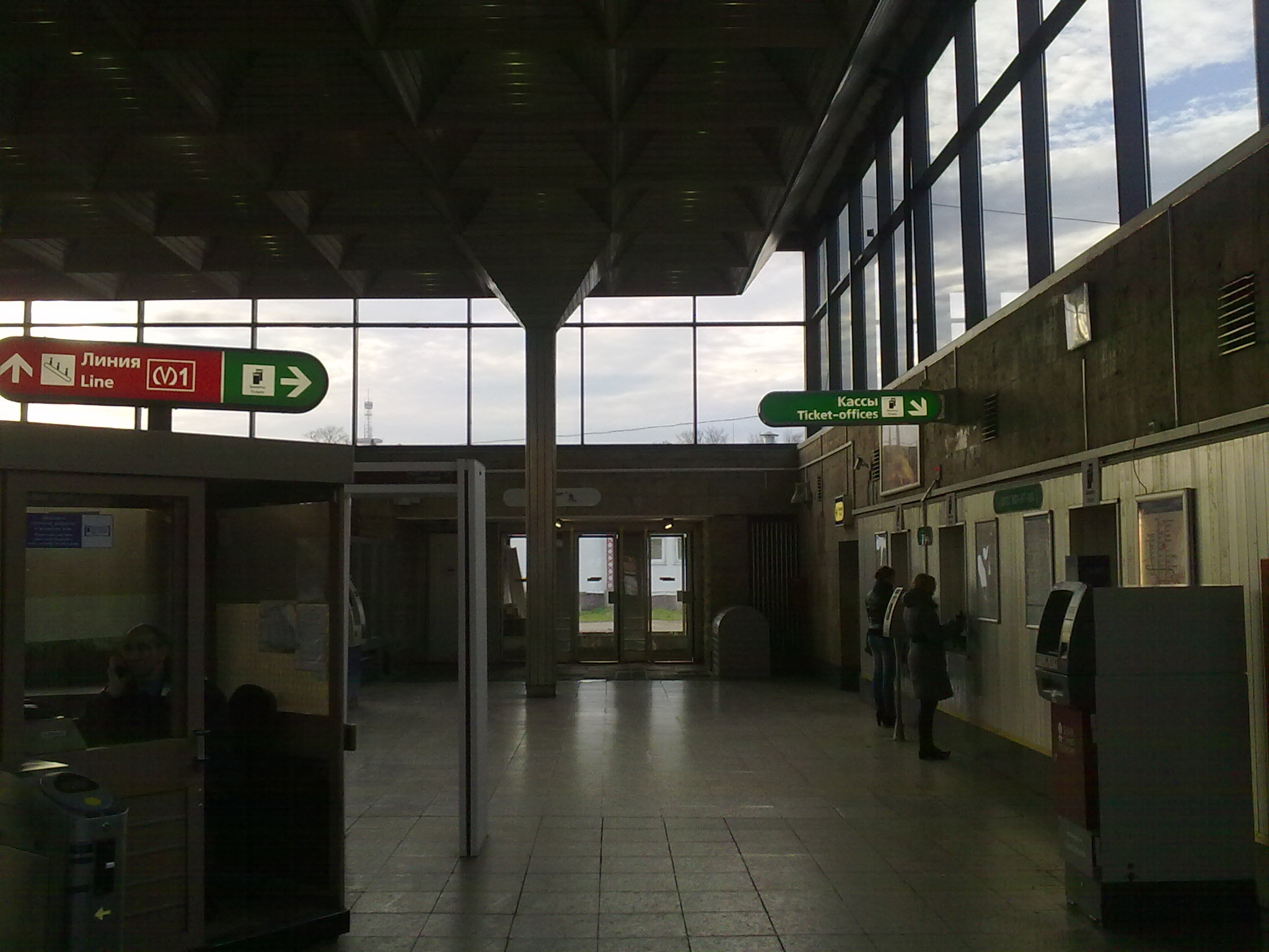 Разглядел, что лайтбокс над выходом на Лесной проспект приделан на две горизонтальные перекладины серого цвета (в глаза не сильно бросается, но вертикальные линии обделки портит).