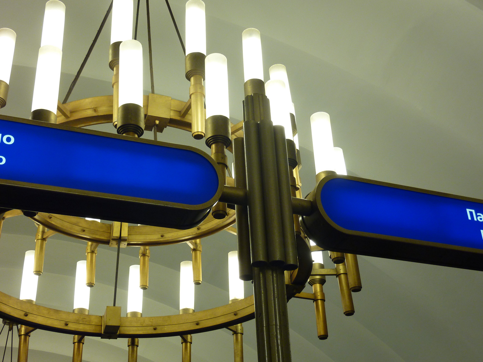Окрас столбов сделан схожим с цветом металла на люстрах. Только по своему наначению они туда совершенно не вписываются: при просмотре с лестницы указатели совершенно скрываются за люстрами.