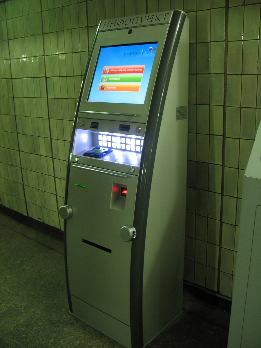 Не знаю, относится ли это к данной теме, но пока напишу сюда - в переходе северного выхода Московской прямо после подъема от дверей вестибюля появился новый терминал под названием "Инфопункт", оснащенный также устройством для пополнения "Подорожника" (а может быть и других БСК, но панель для прикладывания выполнена в виде оного с круглыми вырезами по краям =)) Интерфейс двуязычный, а бегущая строка внизу экрана сообщает на кривом англицком о ведущемся видеонаблюдении. И да, там еще слева есть телефонная трубка вроде бы.