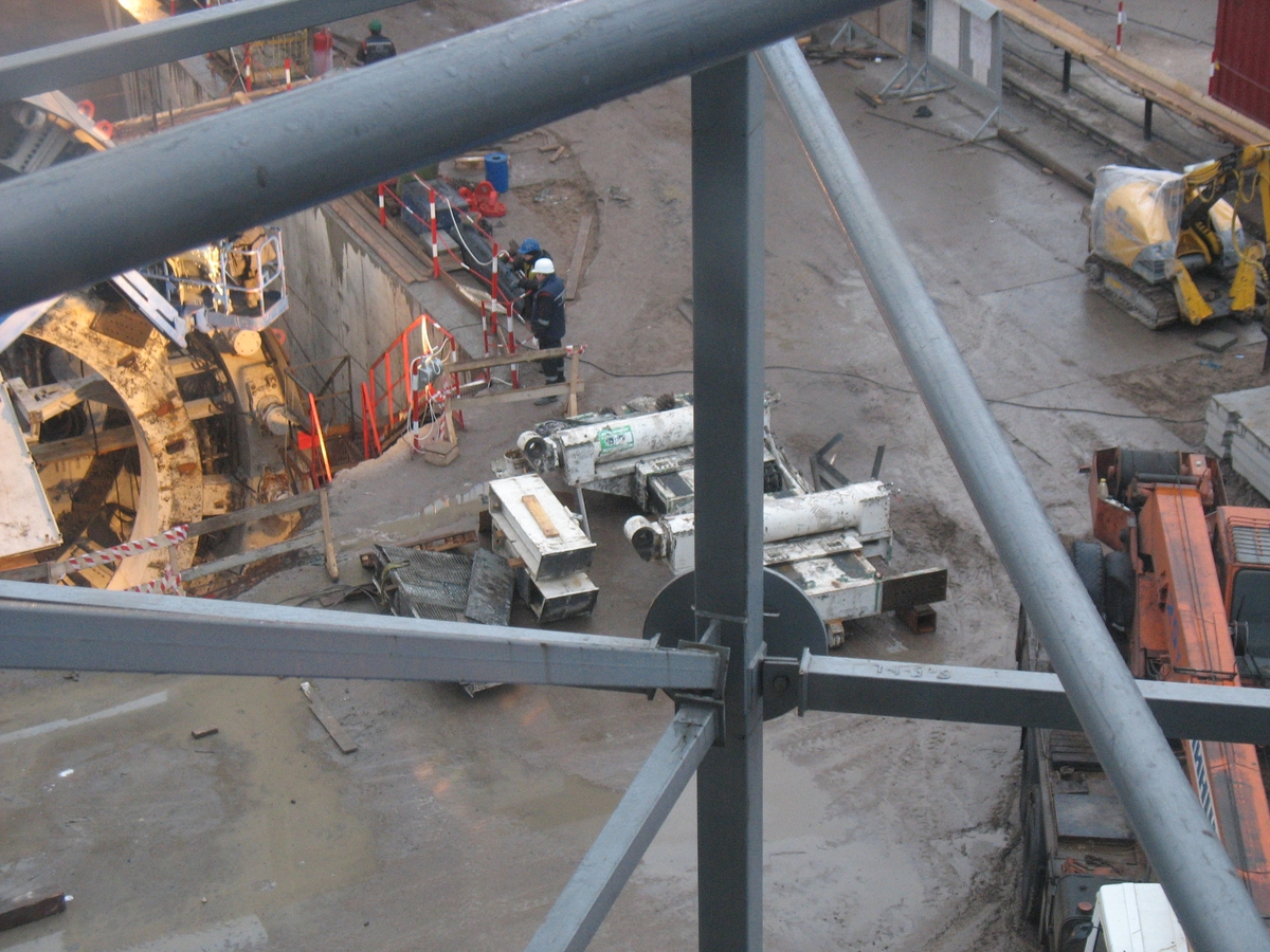 Началась сборка щита, головная часть уже установлена в котловане, только пока стоит вертикально.