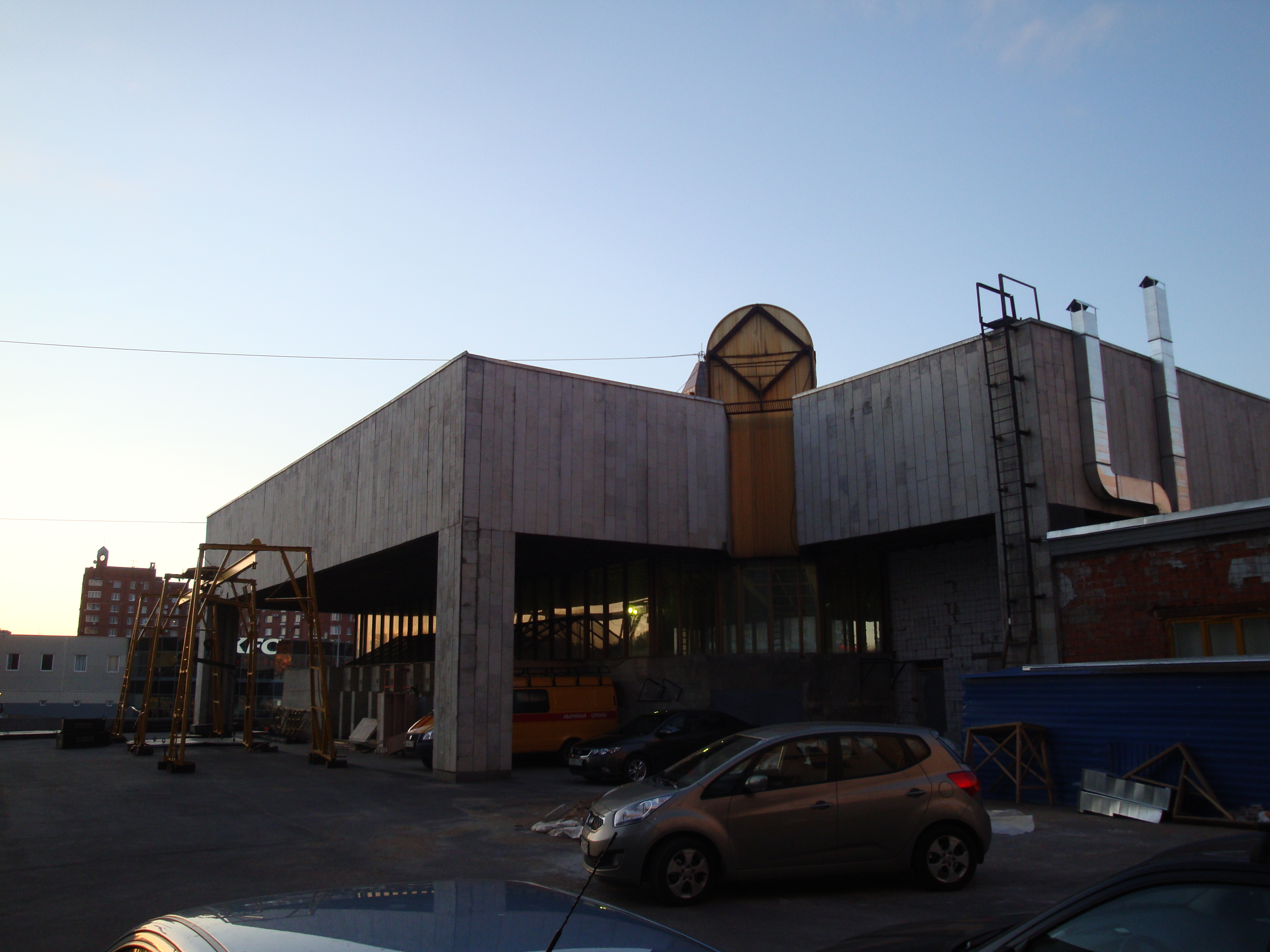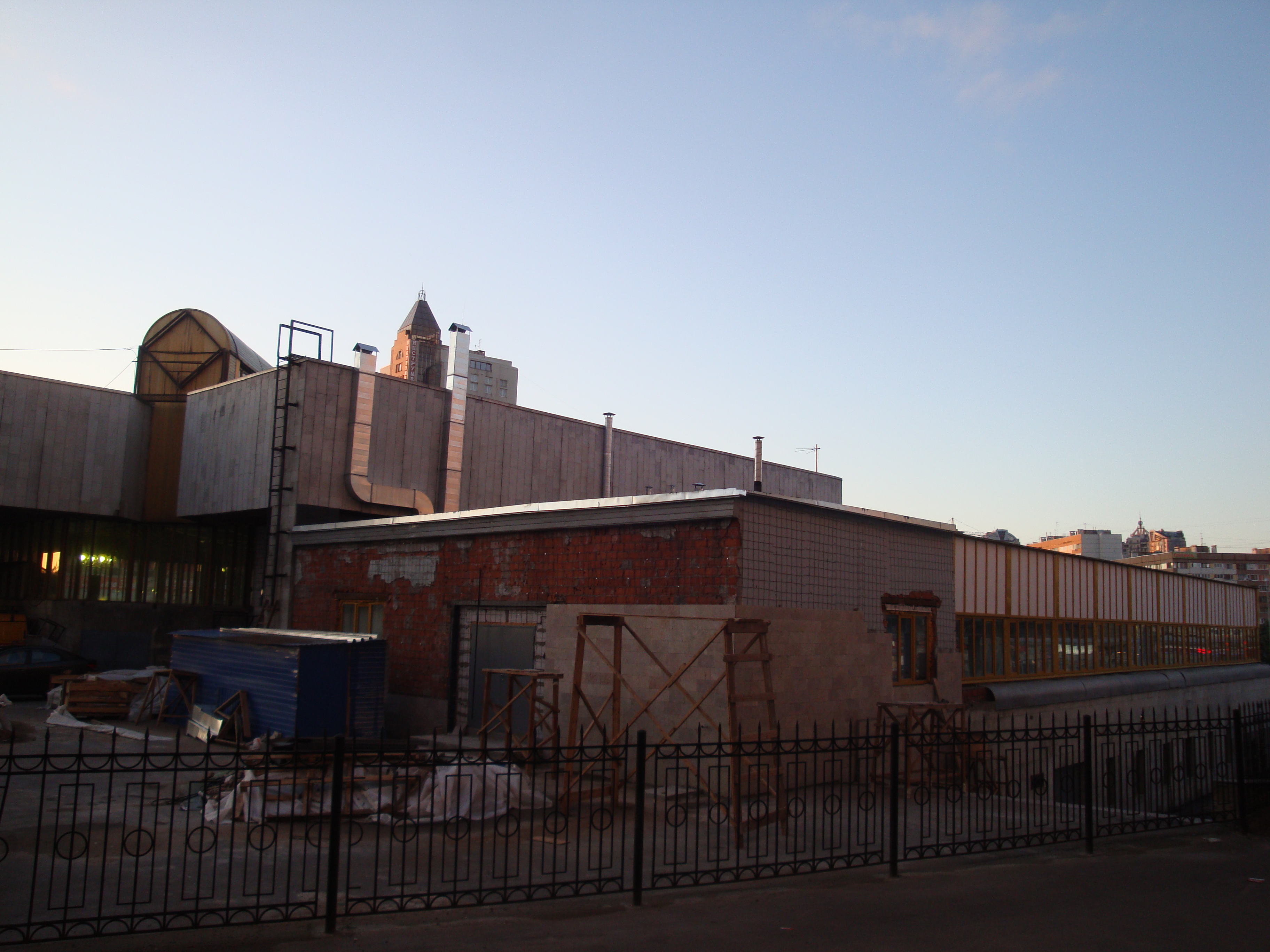 А это двор, фасад вестибюля с другой стороны (позади места съемки - ТЦ "Озерки"). Идет переоблицовка стен "пристройки".