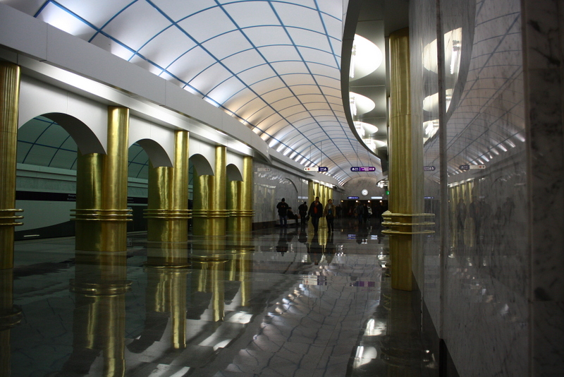 Был на станции рано утром. Даже в 7 утра было много народу в вестибюле (за жетонами что ли стояли) и в вагоны садились. Сложно было поймать кадры без людей. Сама станция откровенно разочаровала, золотые овальные колонны, пластиковый потолок, Атлант с лицом Петра I вертит глобус и ищет где бы прорубить окно в Европу - все это вызывает дисгармонию. В целом станция получилась, но я от нее большего ожидал. Что впрочем, не умаляет её нужность и значимость.