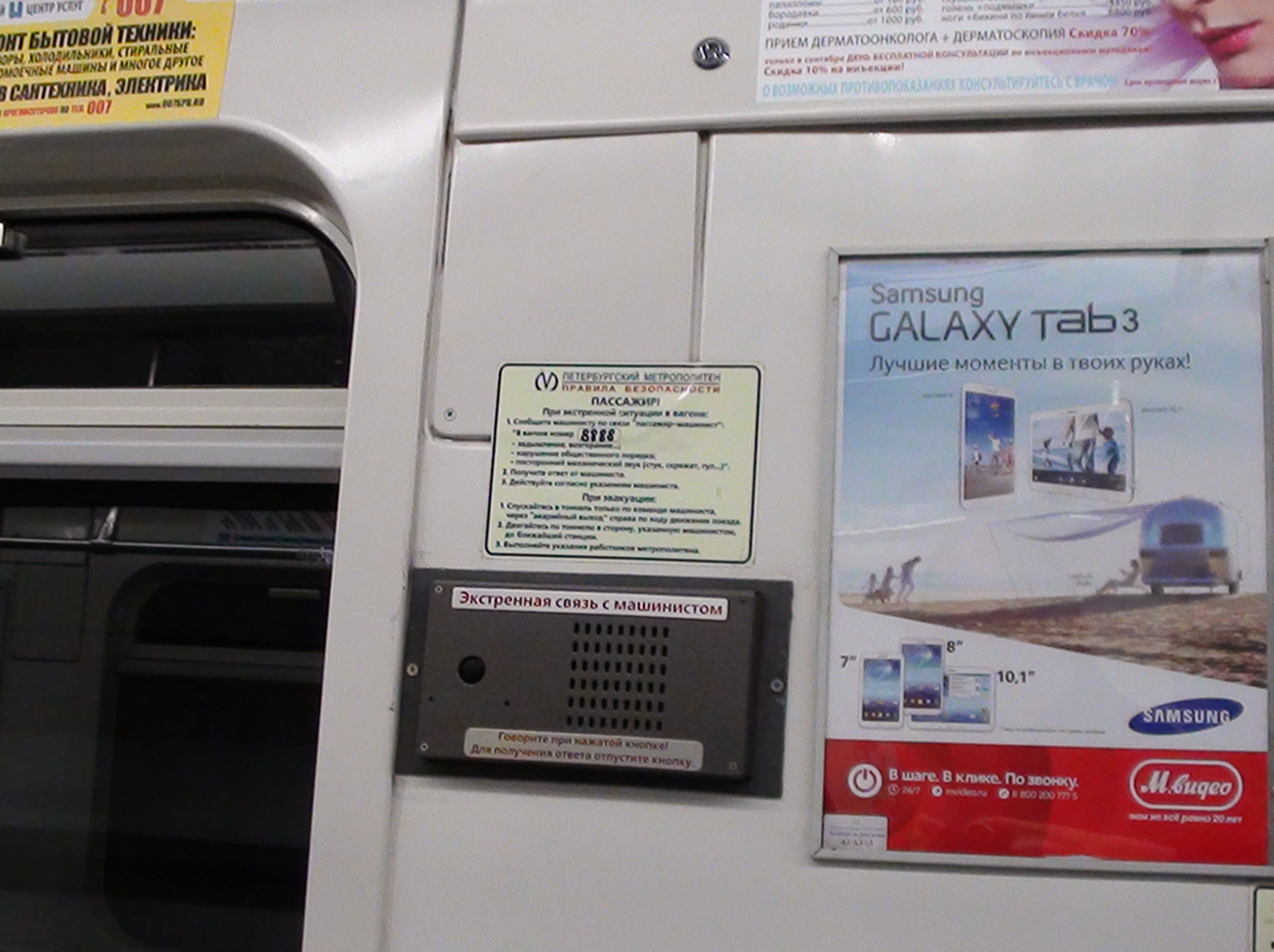 Сегодня ехал в 8888. Опять рекламный маразм крепчал. Из-за рекламноой точки УСПМ разместли ближе к стороне окна, а сверху люк, из-за этого не хватило место для памятки, и наклеили наполовину на стену, наполовину на люк...