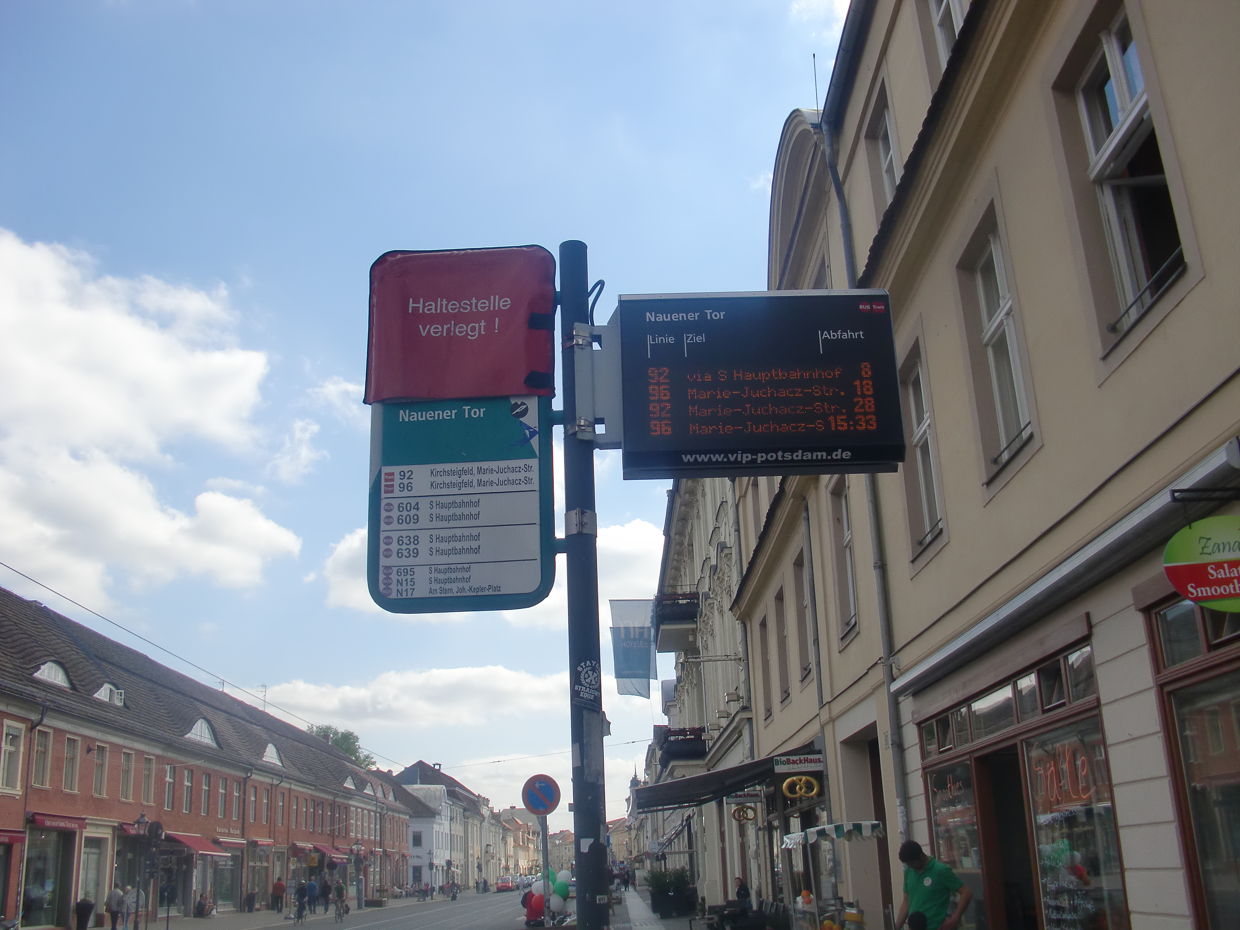 На том же фото из Потсдама светлых тонов дом, и табличка тёмного цвета удачно гармонирует, более того, для неё отдельный столб. Такое заметит любой, кто находится на остановке и интересуется скорым прибытием транспорта.