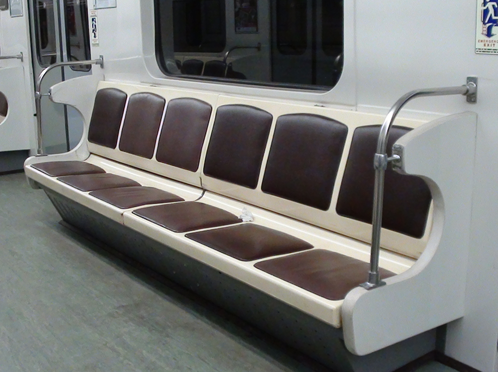 В этот раз немного другой вариант: сидушки - коричневые. Обычно коричневые сидушки передаются по наследству - от этого же вагона (если не сильно изношены, как например сделали в 8964). Но в этом вагоне до модернизации шестипопых никогда не было. Были обычные сиденья (этот вагон снят на видео ещё год назад). Линолеум поменяли на худший из всех, что есть - светло-зелёный (похож на цвет американского доллара) - данный линолеум по моим наблюдениям стирается быстрее всех, на равне с серым, который пошёл с вагонов 11504 и далее, до .2.