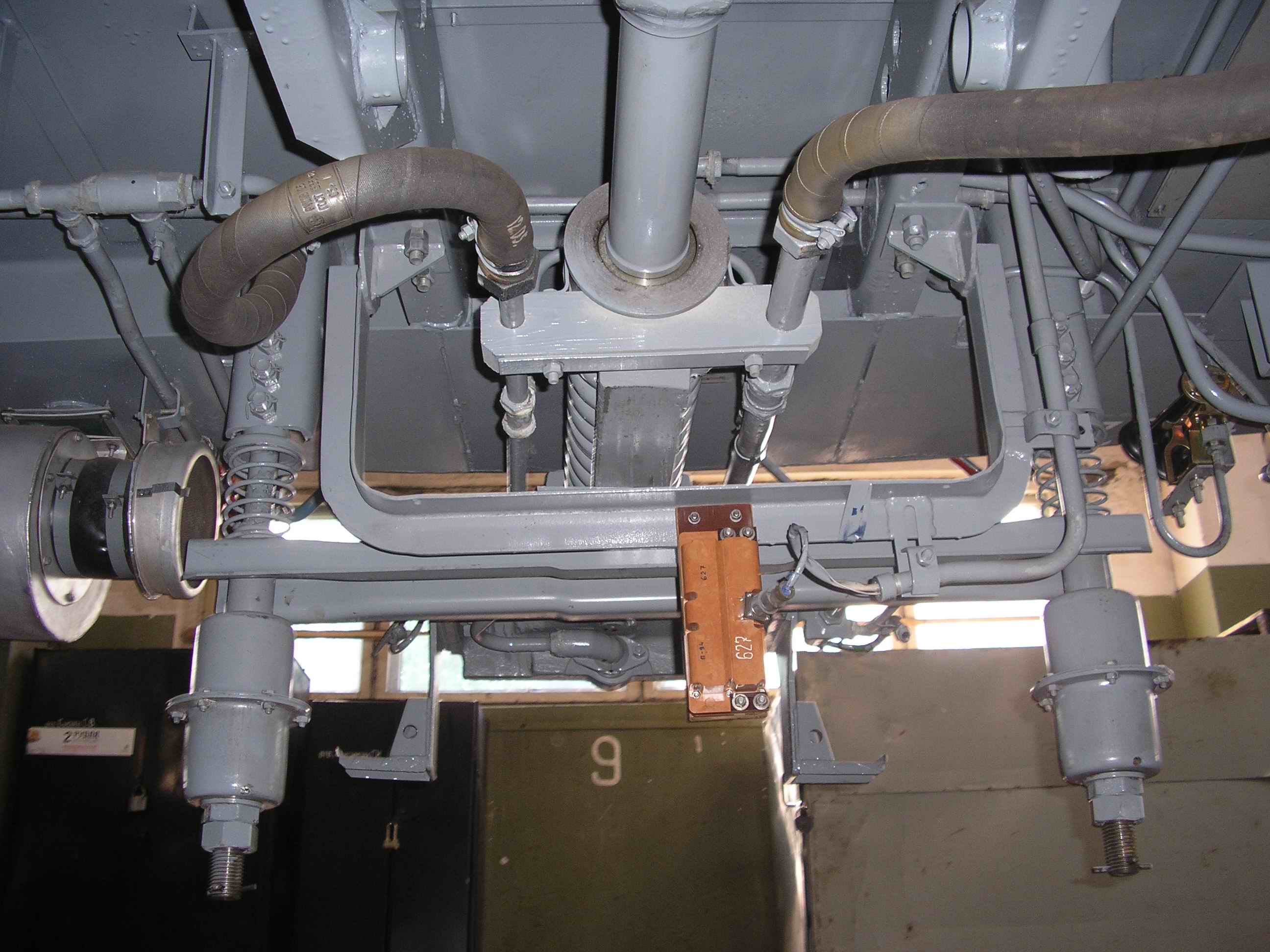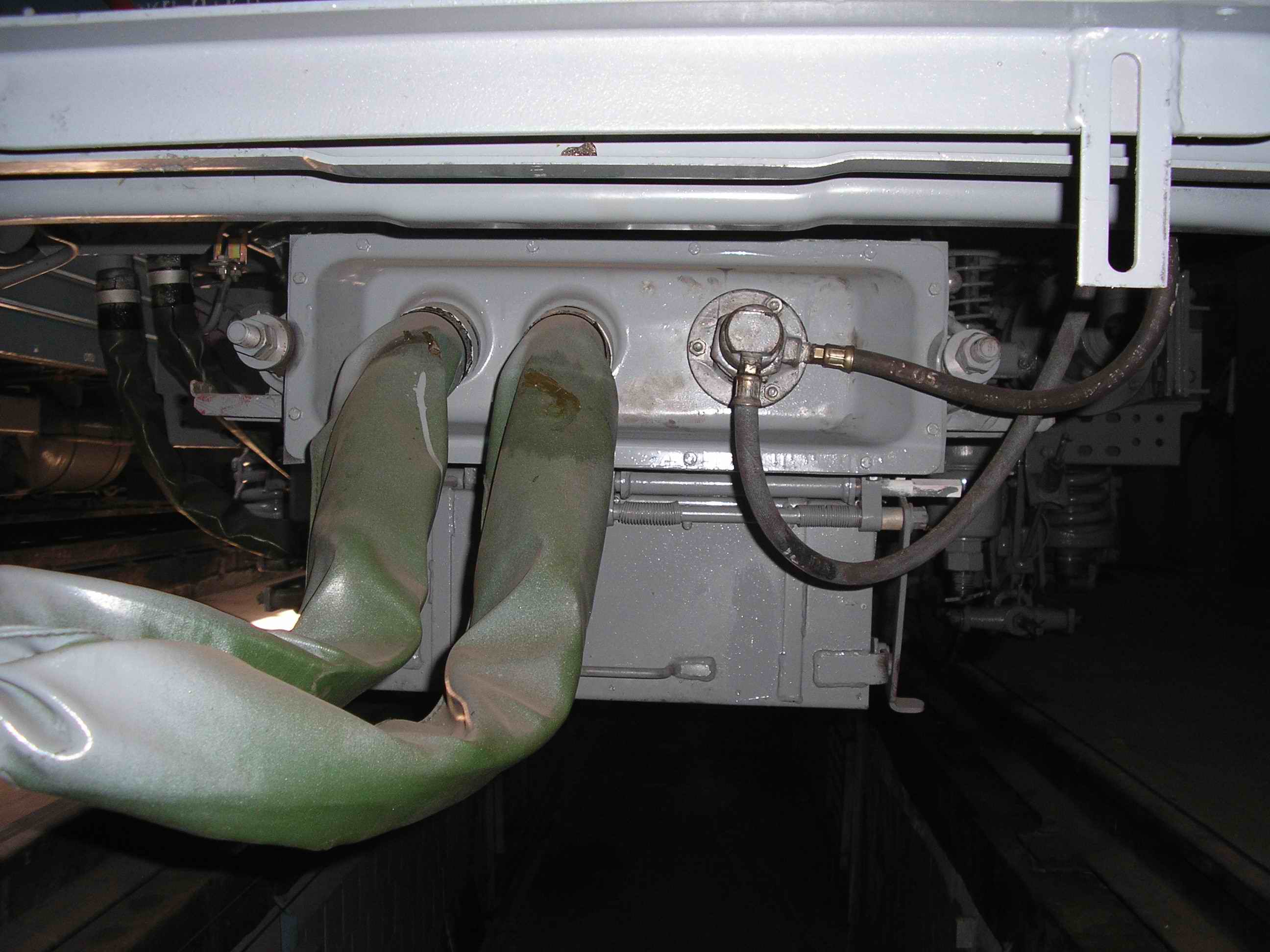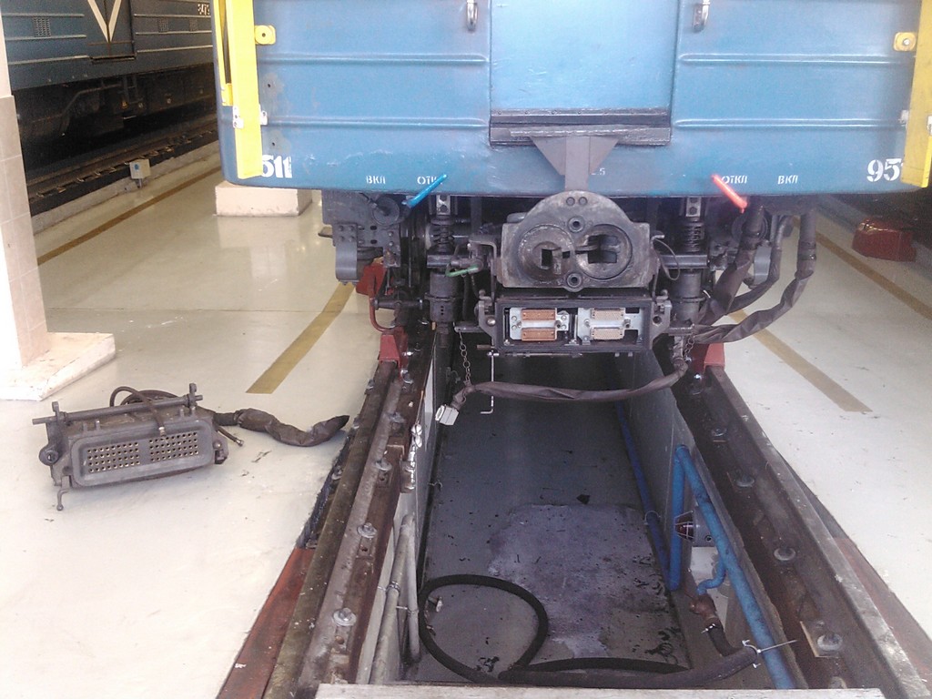 Буферные пружины. Резиновые шланги - напорная и тормозная магистрали, ниже - предохранительная скоба, чтобы при обрыве подвешивания автосцепка не упала на путь. Оранжевый девайс - приёмник устройства поездного оповещения.