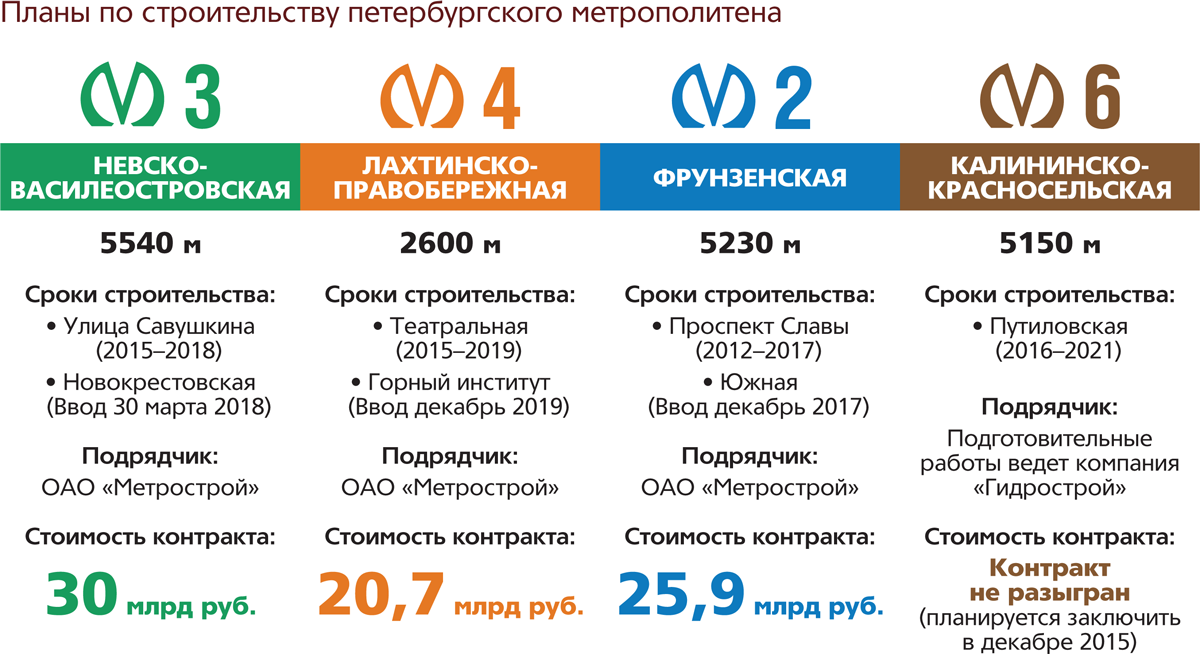 Также в начале осени с ОАО «Метрострой» был подписан контракт стоимостью 20,7 млрд рублей на строительство продолжения Лахтинско-Правобережной линии – от «Спасской» до станции «Большой проспект» на Васильевском острове. В настоящее время идут подготовительные работы в районе Театральной площади и на Васильевском острове. Как отметил Михаил Цалко, несмотря на проблемы, связанные с тесной квартальной застройкой в местах расположения будущих станций, работы идут по плану. Срок окончания первого этапа – декабрь 2015 года. Уже в следующем году метростроители приступят ко второму этапу – строительно-монтажным работам. И нет оснований сомневаться, что в декабре 2019 года новый участок Четвертой линии примет пассажиров.
