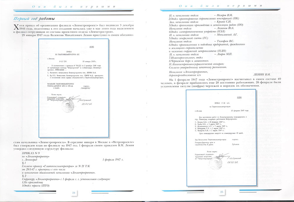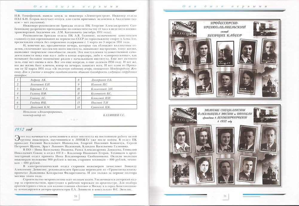 Недавно мне в руки попала одна из целой серии книг про историю Ленметрогипротранса. Она охватывает временной интервал, начиная с момента образования института по 1956-й год. Автором её является Николай Иванович Кулагин, бывший на момент издания генеральным директором ЛМГТ. Помимо огромного количества интересной и нигде ранее не публиковавшейся информации в ней представлены уникальные документы, архивные фотографии, биографии сотрудников и т.д.