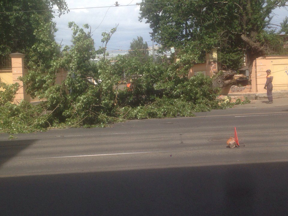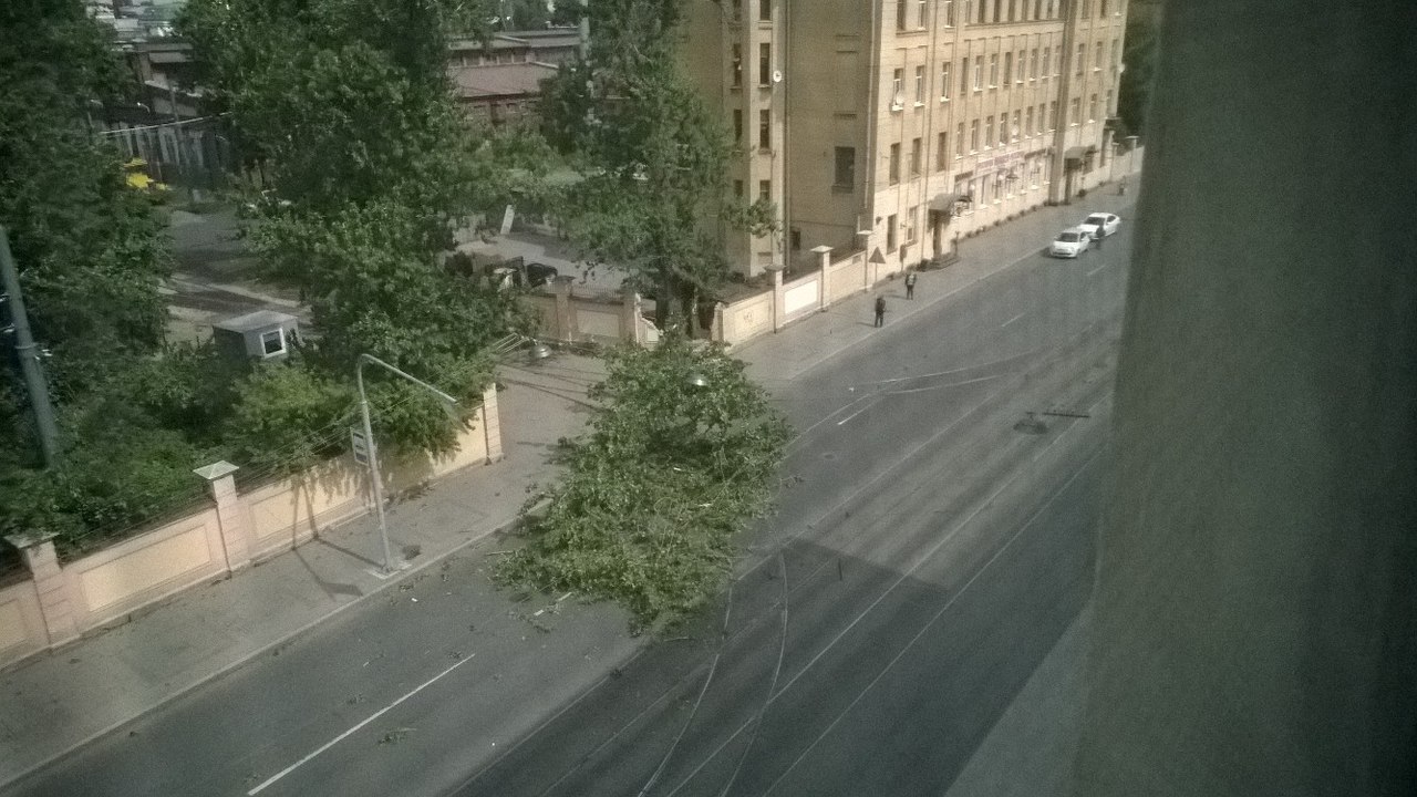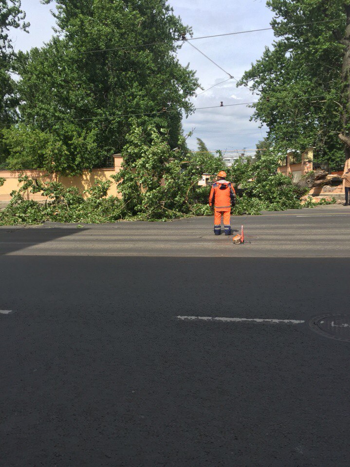 Новость из того же места, но из другой серии. У въезда в Леоновку упало деверо, порвало провода и снесло часть ограды. Трамваи в сторону Приморской встали.