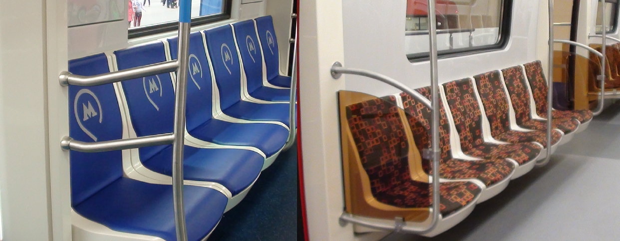 В 81-765 чуть лучше дела с поручнями, там они в другую сторону загибаются, что препятствует свисанию чего-либо на сидящего, но можно и верхние витки было сделать. И сами сидушки гораздо лучше, чем в Мясе. В "Москве" хотя бы они такие же дерматиновые как и в большинстве всех вагонов в РФ.