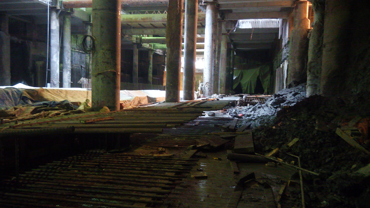 Поднимаемся к перекрытию на отметке 6.40. Этот ярус в строительных конструкциях готов процентов на 60. Продолжается разработка грунта, гидроизоляция стен, параллельно идет армирование, сборка опалубки и бетонирование самого перекрытия.