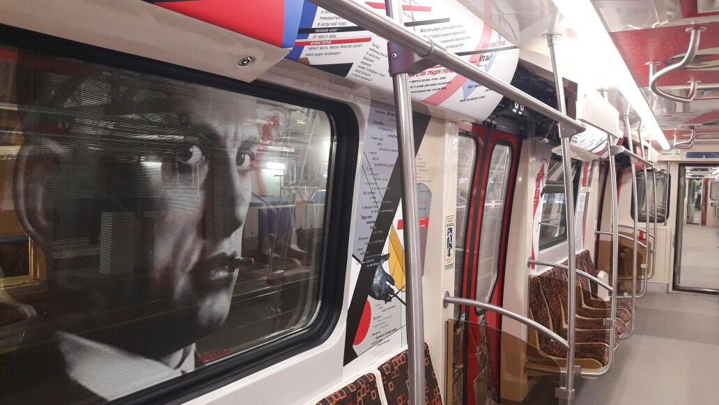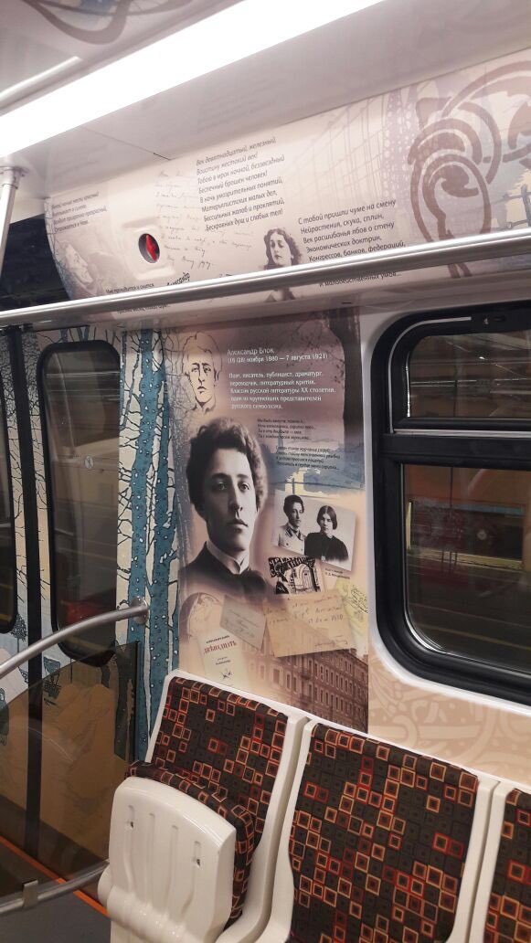 "Восьмивагонный состав модели 81-722/81-723/81-724 в красном исполнении украшен изнутри отрывками из произведений великих русских писателей и поэтов, чьи имена тесно связаны с историей Петербурга (Пушкин, Маяковский, Достоевский, Чернышевский, поэты Серебряного века)", - рассказала пресс-секретарь петербургской подземки Юлия Шавель.