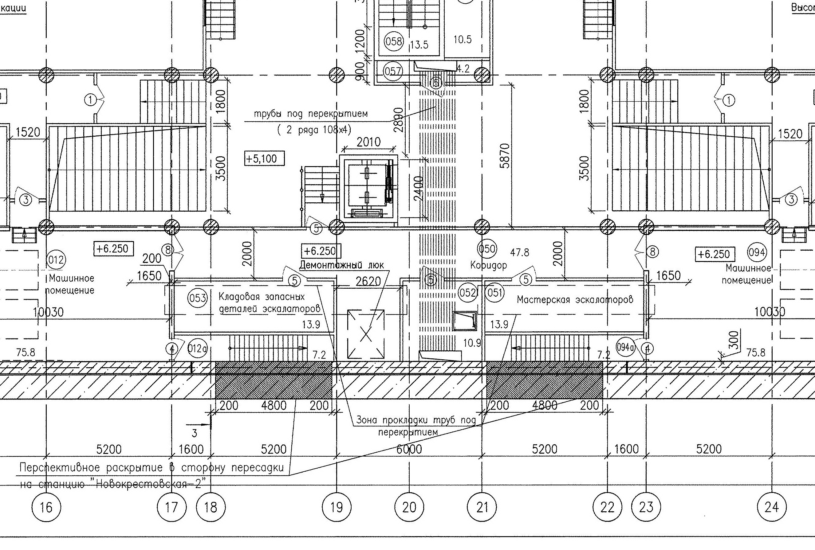 Если мы внимательно посмотрим проектную документацию то увидим, что заделы под пересадочные проёмы есть на всех трёх пассажирских уровнях. С верхним уровнем (кассовый зал) и нижним уровнем (пассажирская платформа) всё понятно. Остаётся вопрос по среднему уровню - переходному мостику. Заделы под проёмы там есть - это видно по чертежу №1. По тому же чертежу видно, что у боковых стен есть возвышения (уровень +6.250) относительно уровня мостика (+5.100) и на этих возвышениях находятся вспомогательные помещения эскалаторной службы и коридоры, соединяющие в одном уровне половинки станции. На каком же уровне находится проём под пересадку? Это видно из чертежа №2 - строительный чертёж перекрытий, сечение по мостику. Проём находится на уровне мостика (+5.000). А как устроено это возвышение у стены? Это видно из чертежа №3. Делая вывод из увиденного - задел под пересадку по переходному мостику есть и он находится на уровне мостика, но на скорое строительство второй станции проектировщики не рассчитывают и поэтому временно разместили на будущем переходе технологические помещения. А когда-нибудь потом (кто его знает когда?) они пойдут под снос.