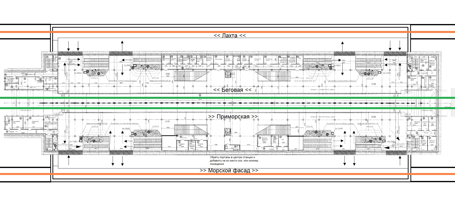 Есть на станции загадочные для меня места (выделил красным) на среднем уровне, примыкающие к переходному мостику. На чертежах обозначены голубым - пассажирская зона, но в спецификации помещений назначения нет. Место тупиковое, без транзитного трафика. Что это? Торговля, кассы стадиона, выставка кубков "Зенита"?