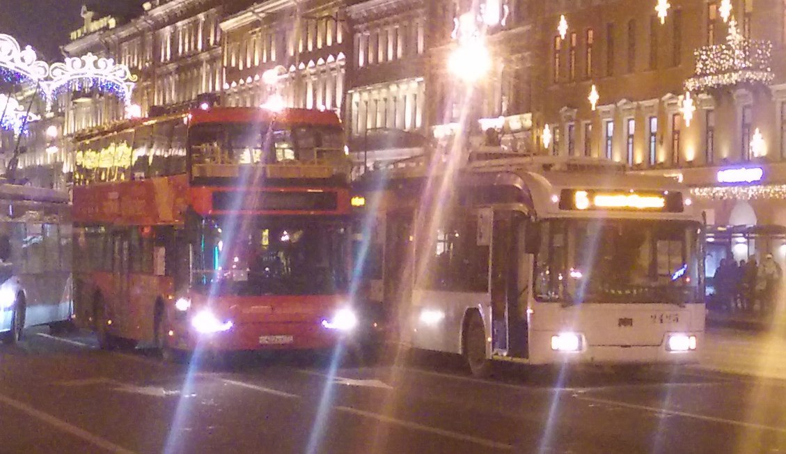На Невском, напротив Стокманн троллейбус 5-го маршрута, взял и забодал рогами двухэтажный автобус. Рог обломал и загнул об крышу автобуса...