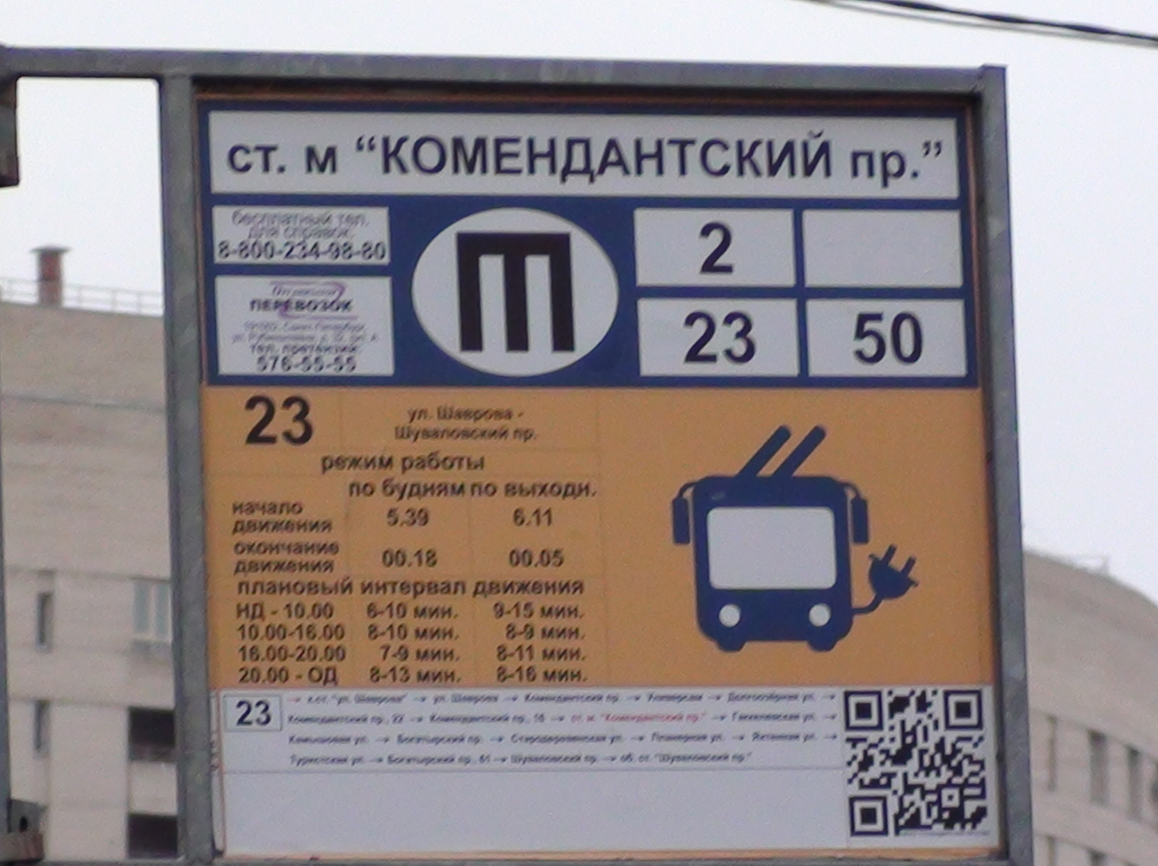 Сегодня, в первый день работы у м. Комендантский пр. был простой из-за маршрутки, у которой отвалилось колесо. Стояли 2 и 50 маршруты. 23-й объезжал, снимая автоматически штанги. Потом снова надевал.