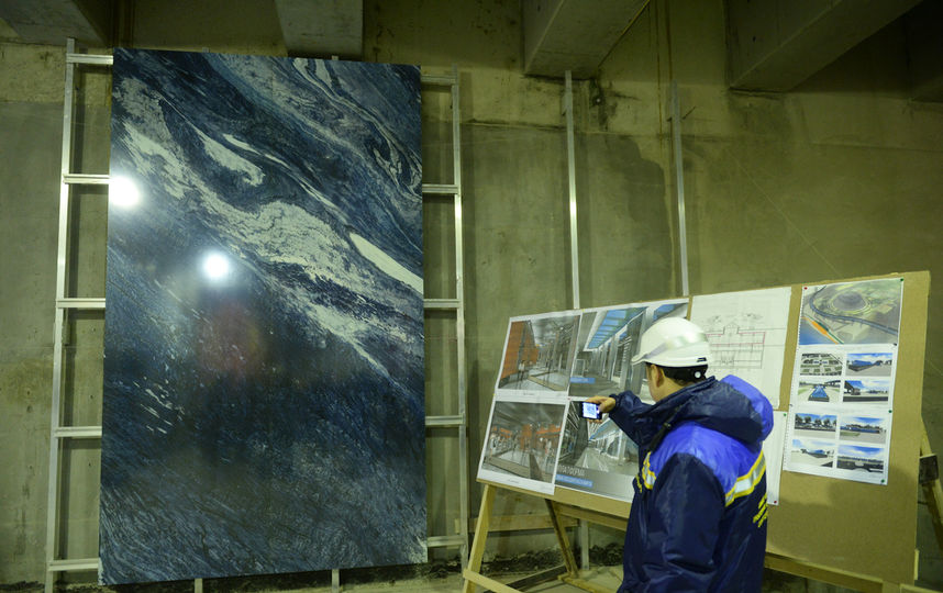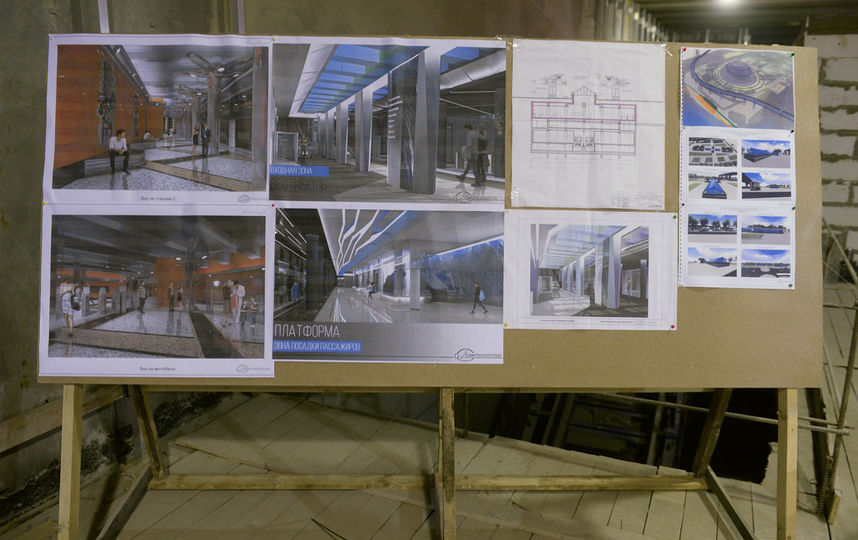 Есть довольно интересные фотки, например с элементом отделки и ракурс с платформы на каркас станционных дверей и стенд с рендерами станций.