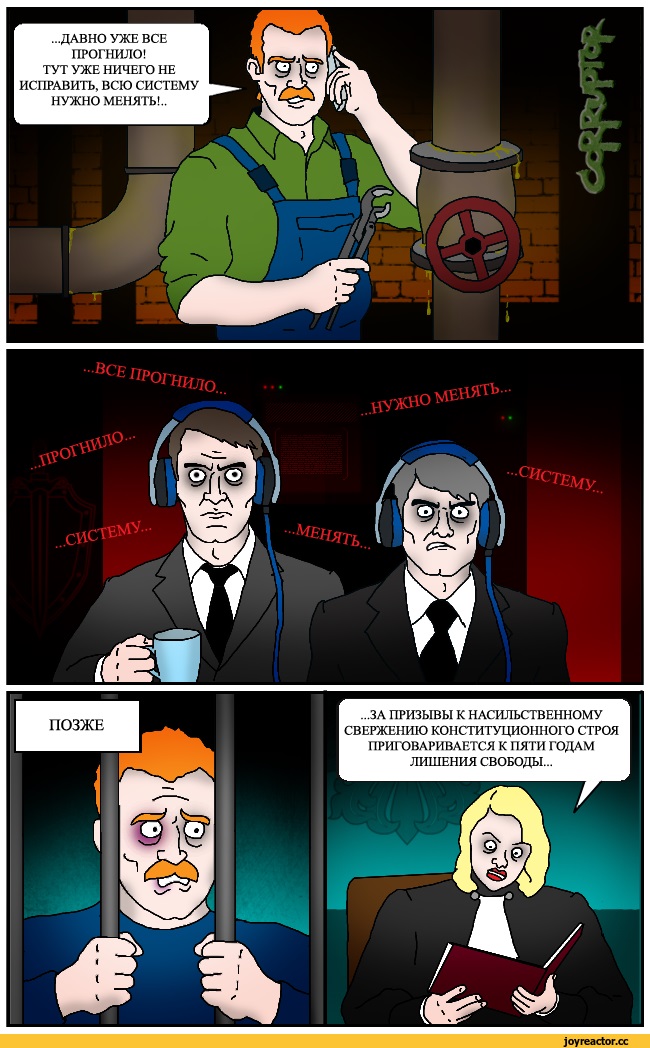 И даже картинка про сантехника и ФСБ говорит о том, что они не задачу исполняют, а занимаются мизинтерпретацией в корыстных целях. "Менять всю систему"- нет указания на насильственный характер изменений! Очень правильный комикс!