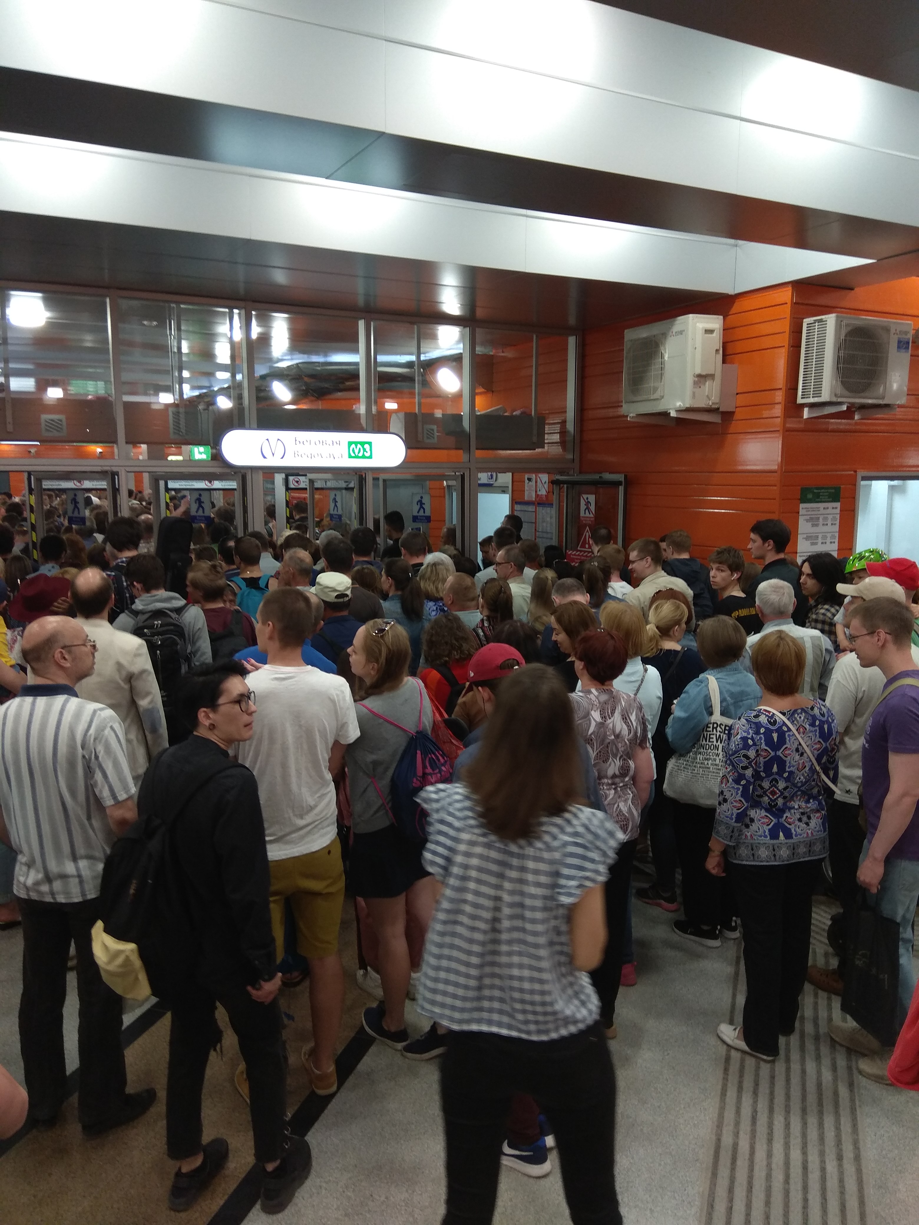 Первый поезд с Приморской ушел в 21:00. Его ждало человек 150. Пришел на Новокрестовскую в 21:04, на Беговую в 21:07. Выйти на Беговой вышло легко, а вот очередь на вход была огромная.