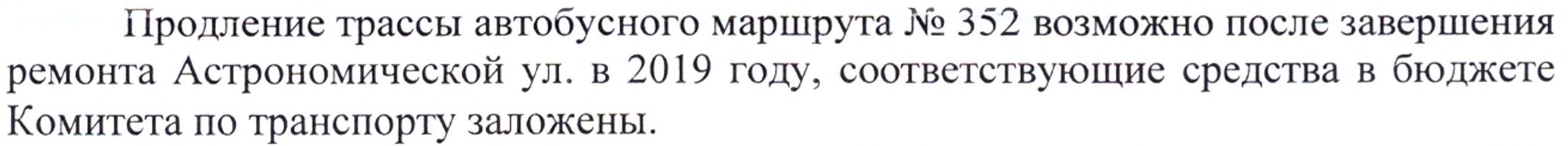 На выездном совещании, проведённом 7 декабря, было отмечено, что дорожное покрытие на Астрономической улице находится в ненормативном состоянии. Продление автобусного маршрута № 352 будет осуществлено только после окончания ремонта указанной улицы (причём ремонт Астрономической улицы запланирован Комитетом по развитию транспортной инфраструктуры на этот год).