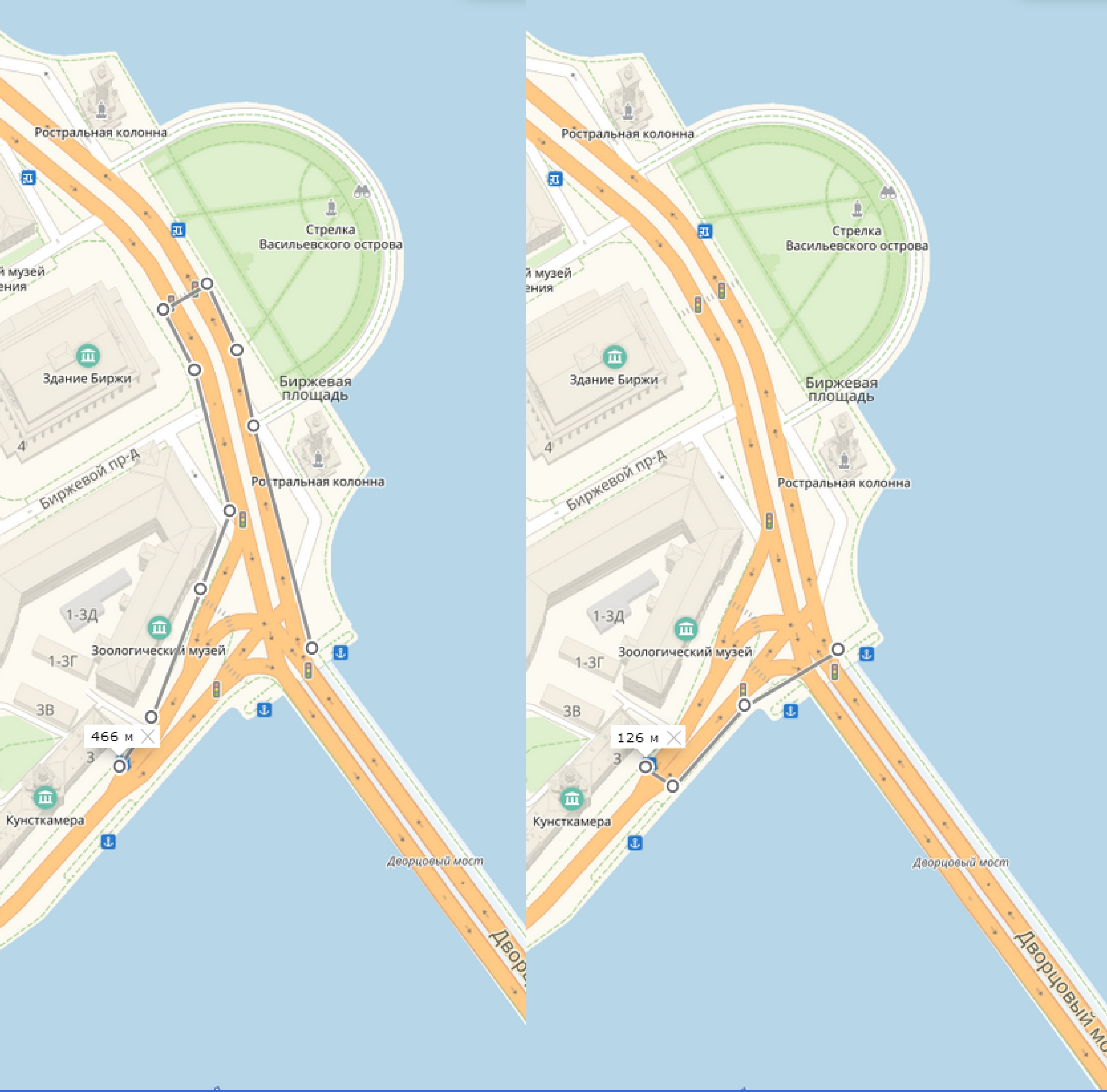 2. Переход с Дворцового моста в сторону ВО. После перехода моста по правую сторону обнаруживаешь, что перехода нет. Нужно долго-долго идти вдоль колонн. (см. фото). В итоге наматываешь 466 метров. Вместо 126.