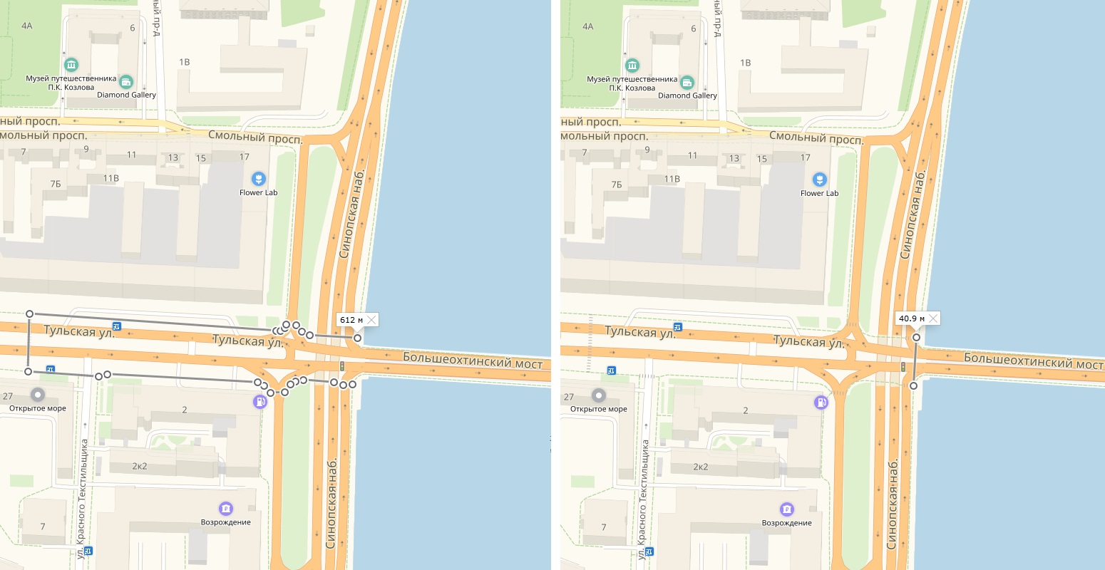 Первый пример на картинке (через Лиговский) не очень удачен. Если обходить по другой стороне, то получится на 100 метров короче. Почему автора темы не устроил такой вариант обхода, он почему-то нам не счёл нужным объяснять. Хотя наругать даже такой вариант теми же словами было парой пустяков, оговорившись только, что по другой стороне будет ещё дольше.