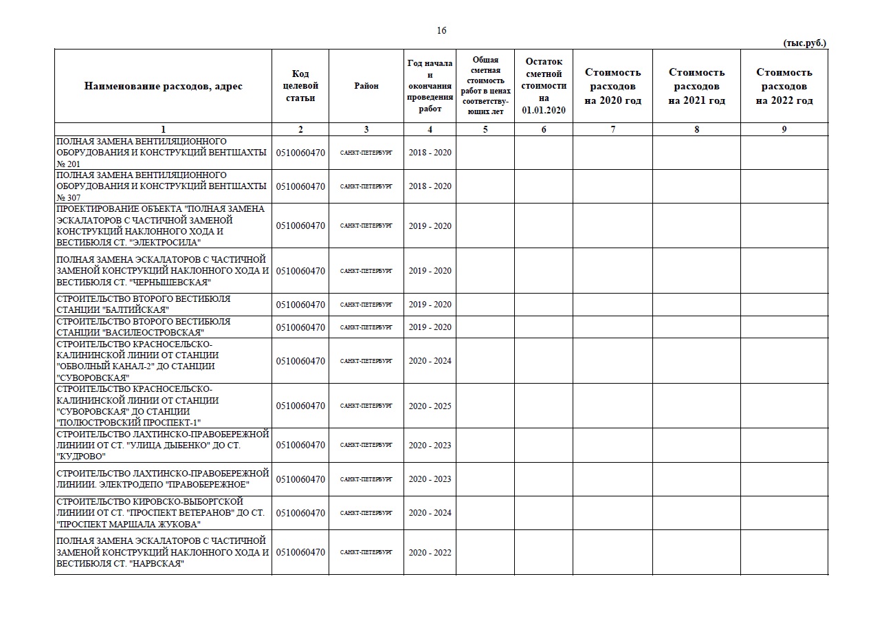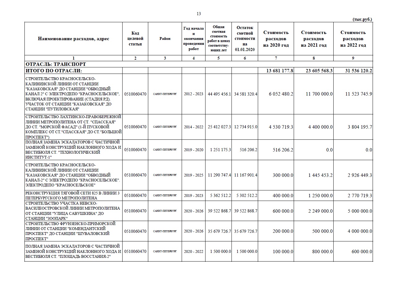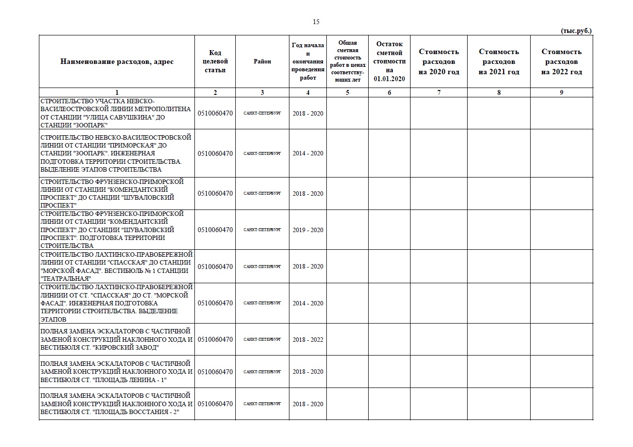 Опубликован проект Законопроекта Санкт-Петербурга "О бюджете Санкт-Петербурга на 2020 год и на плановый период 2021 и 2022 годов". Выписка из Адресной инвестиционной программы на 2020-2022 годы в части, касающейся метрополитена: