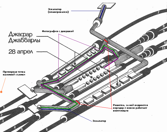 Возможно, нарисованное мной темно-зеленое "колено" не совсем верно, т. к. при выезде со станции поезд слегка поворачивает вправо (т. е. к "Хатаи"), и только потом влево, начиная карабкаться на горку к "Гянджлику". Следовательно, возможен вариант, что нарисованного мной "колена" нет, а путь от "28 мая" к "Гянджлику" частично проходит по старому тоннелю на "Хатаи" (пунктирному), существование которого мной подвергнуто сомнению. Впрочем, тогда "колено" просто выгибается в другую сторону. :) Хоть убей, не помню, как ходили поезда до открытия "Джафар Джаббарлы".