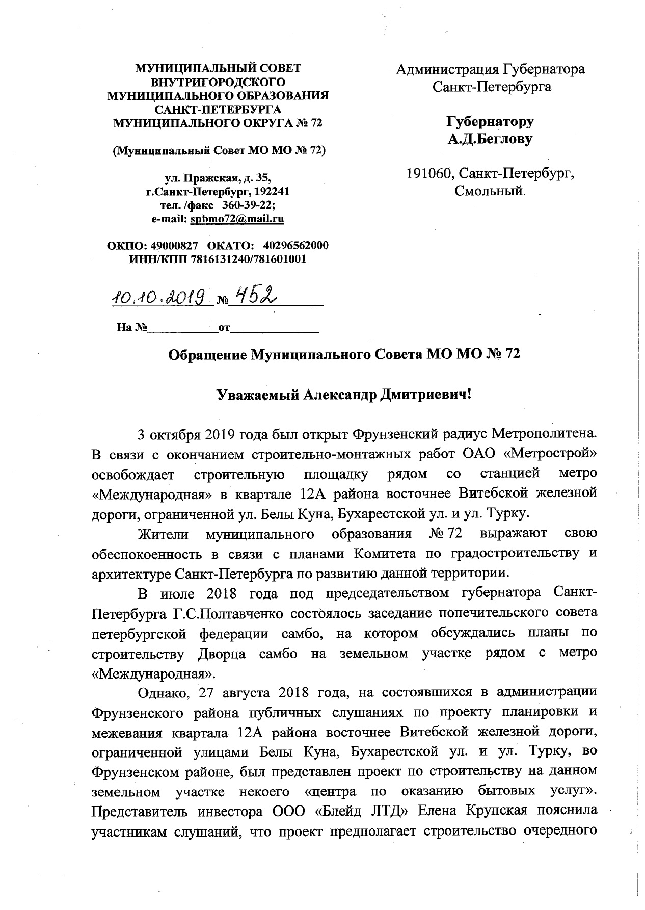 Также на заседании было озвучено, что против строительства нового ТРК выступило муниципальное образование № 72. В октябре муниципальный совет обратился к Александру Беглову с просьбой разместить на освободившимся земельном участке культурный или спортивный объект (https://vk.com/spbmo72?w=wall-187034734_59).