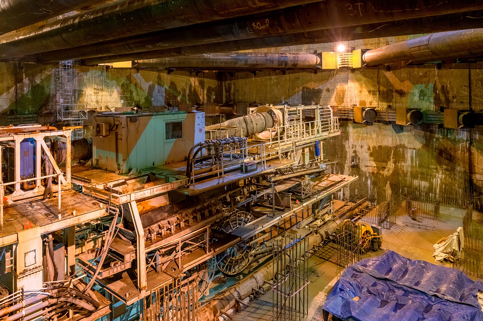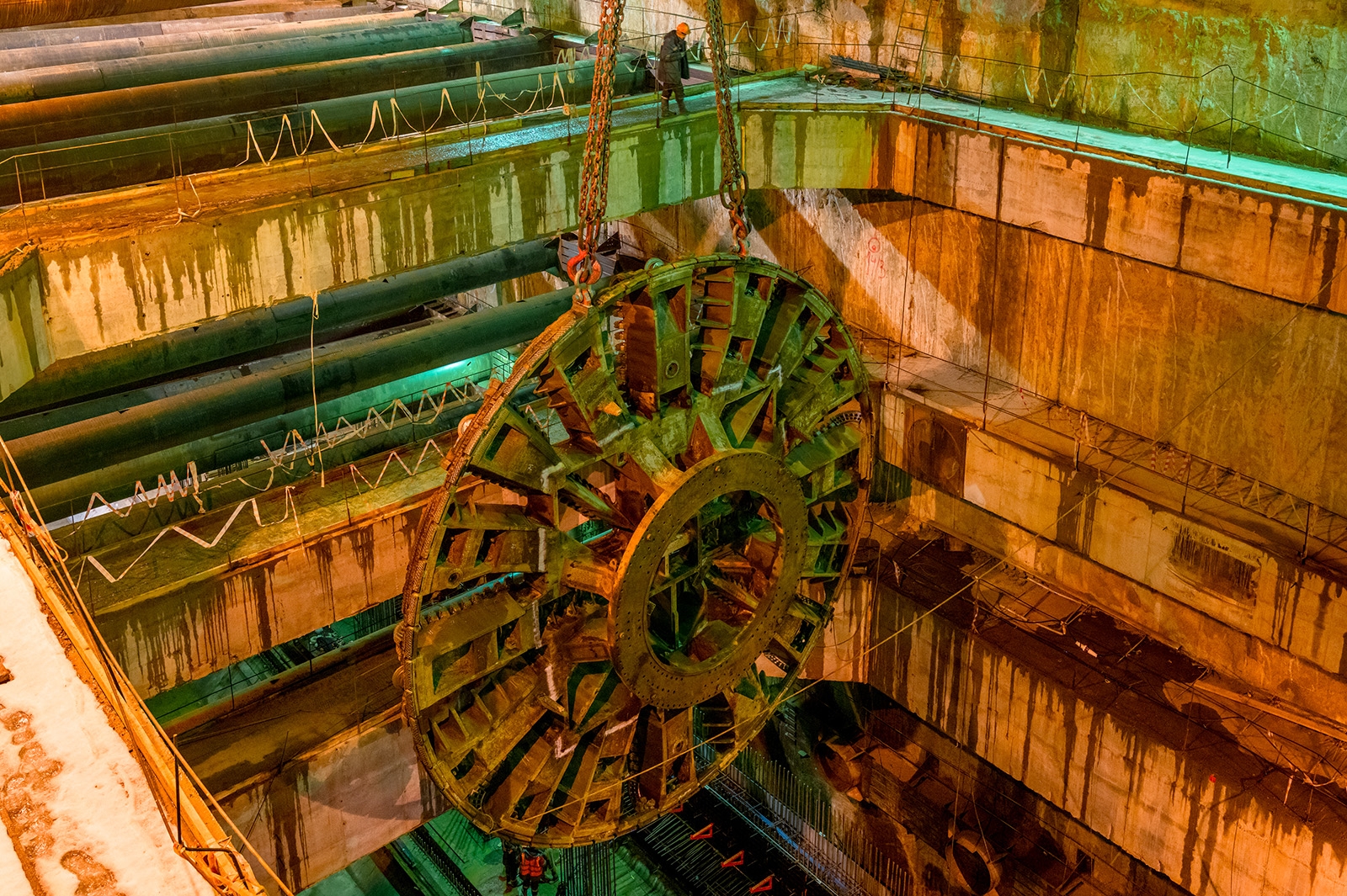 Сборка щита-гиганта – сложный технологический процесс. Сначала на поверхности была проведена укрупненная сборка трех технологических телег тоннелепроходческого механизированного комплекса (ТПМК) весом 90, 150 и 126 тонн, а также сварка 160-тонного ротора. Затем эти элементы опустили в котлован с помощью крана. Головная часть щита весом более 780 тонн опускалась отдельными сегментами и собиралась в котловане.