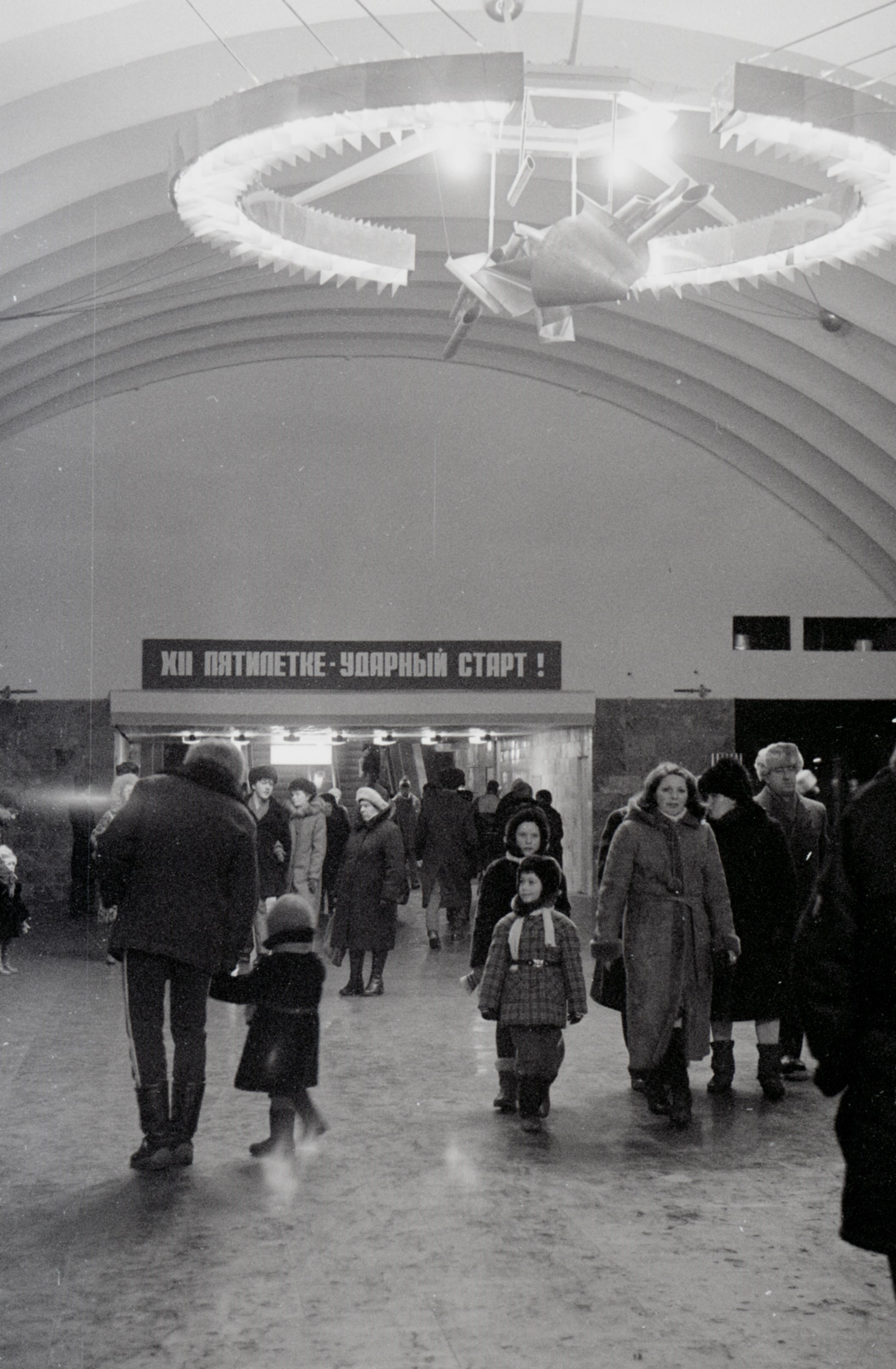 Станция «Красногвардейская» Ленинградского метрополитена со «знамёнами» на потолочных светильниках. Автор фото Михаил Макаренко, 1 августа 1987 года.
