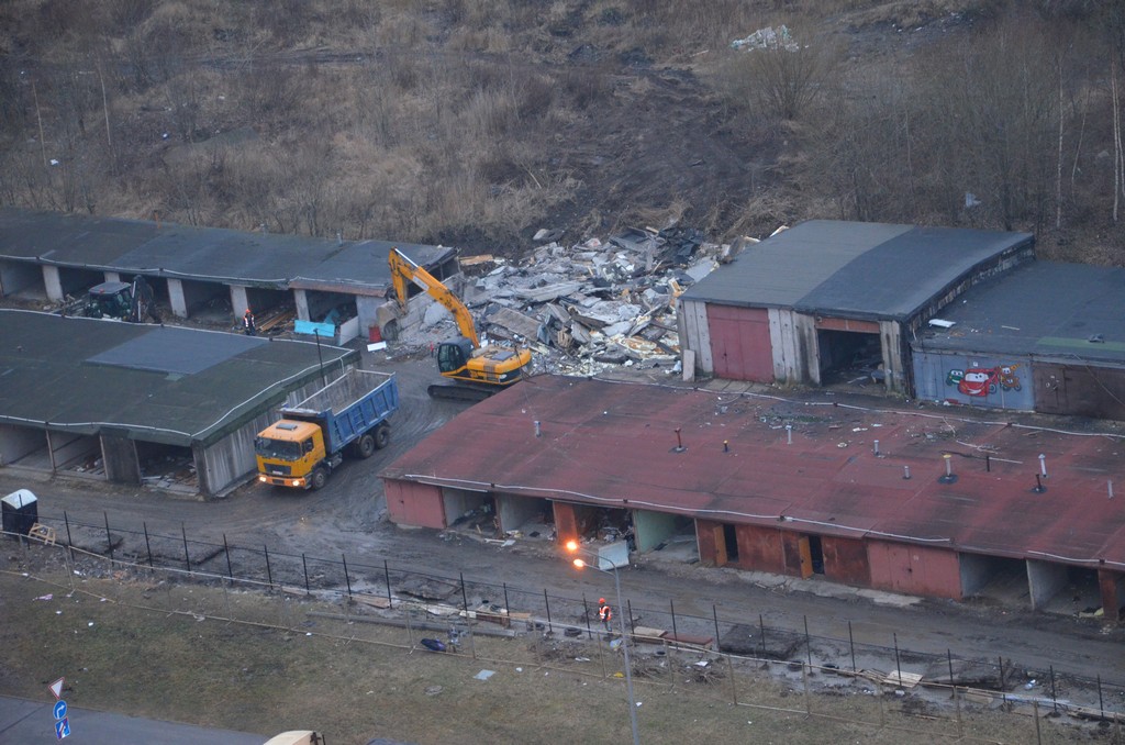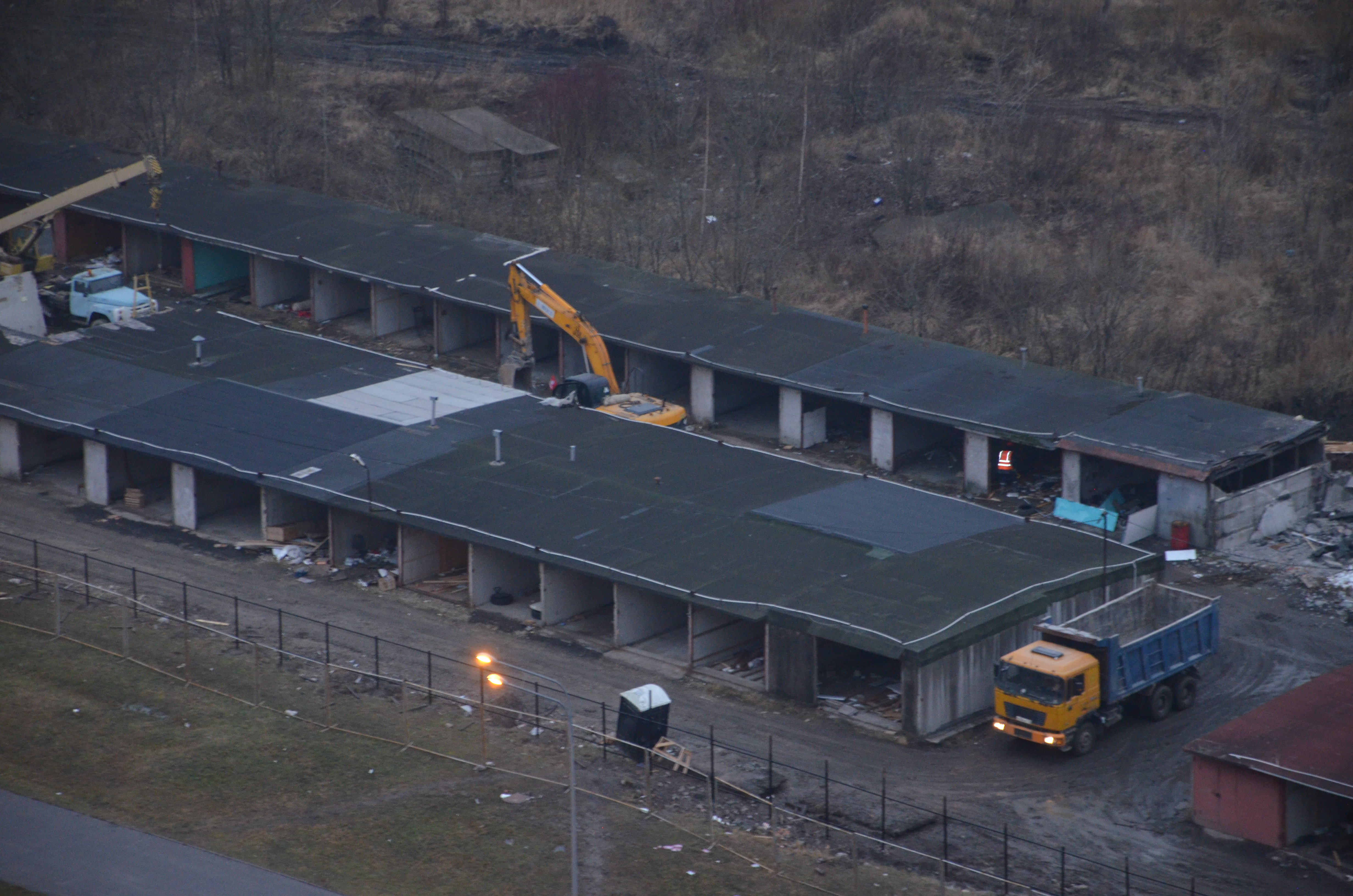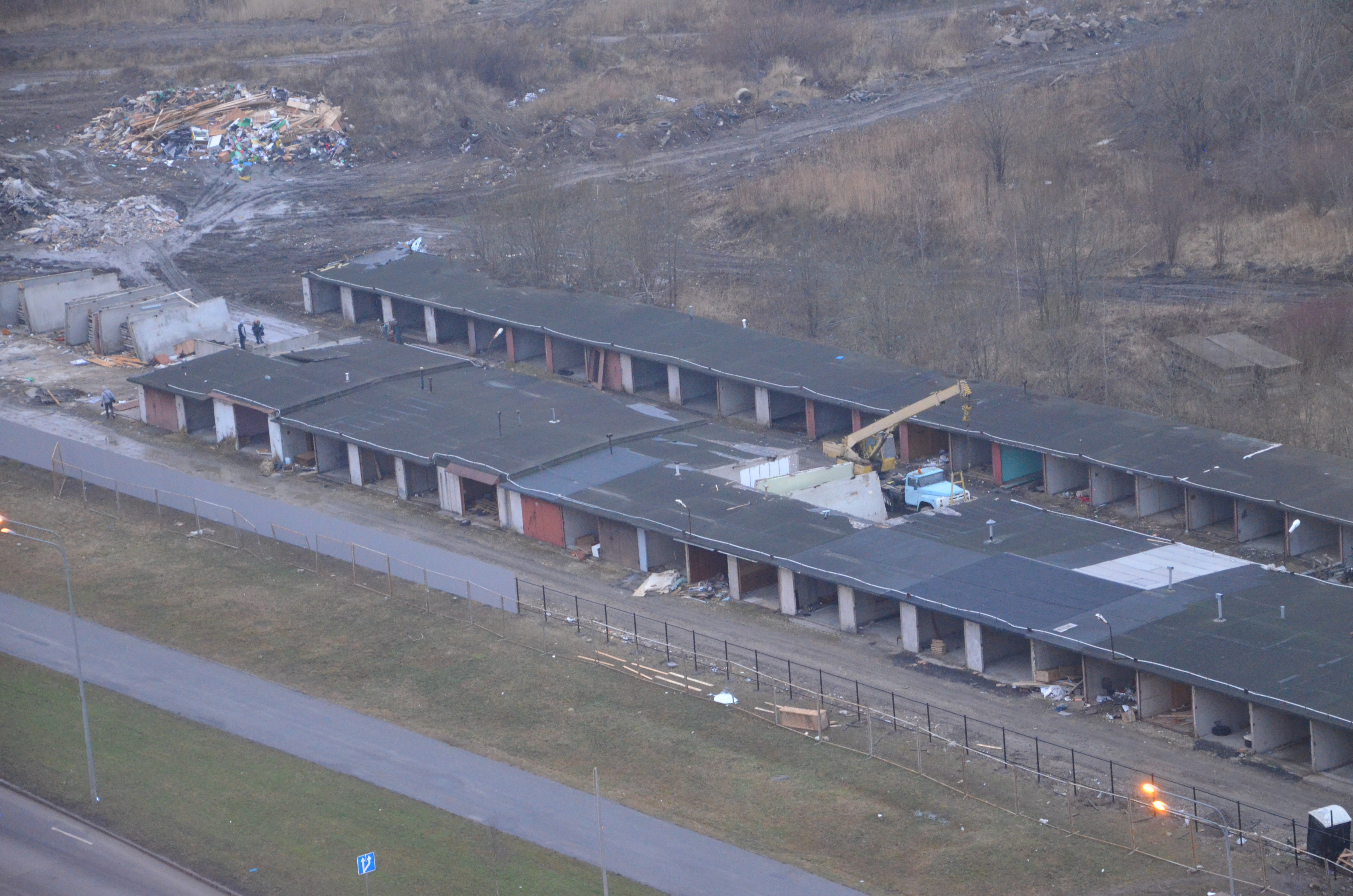 Разбирают гаражи, делают ограждение, кладут плиты для временной дороги.