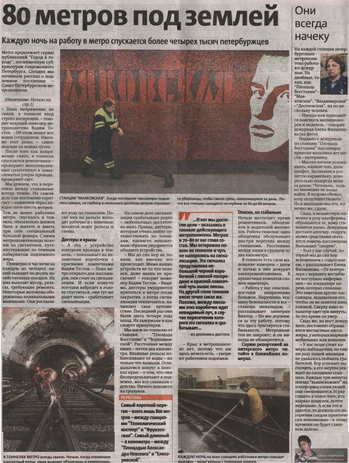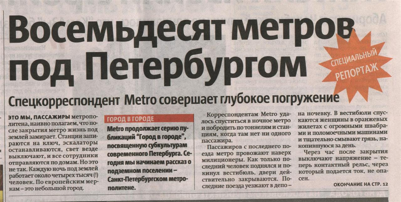 "Metro продолжает серию публикаций "Город в городе", посвящённую субкультурам современного Петербурга. Сегодня мы начинаем рассказ о подземном поселении - Санкт-Петербургском метрополитене ..." © Metro 2006