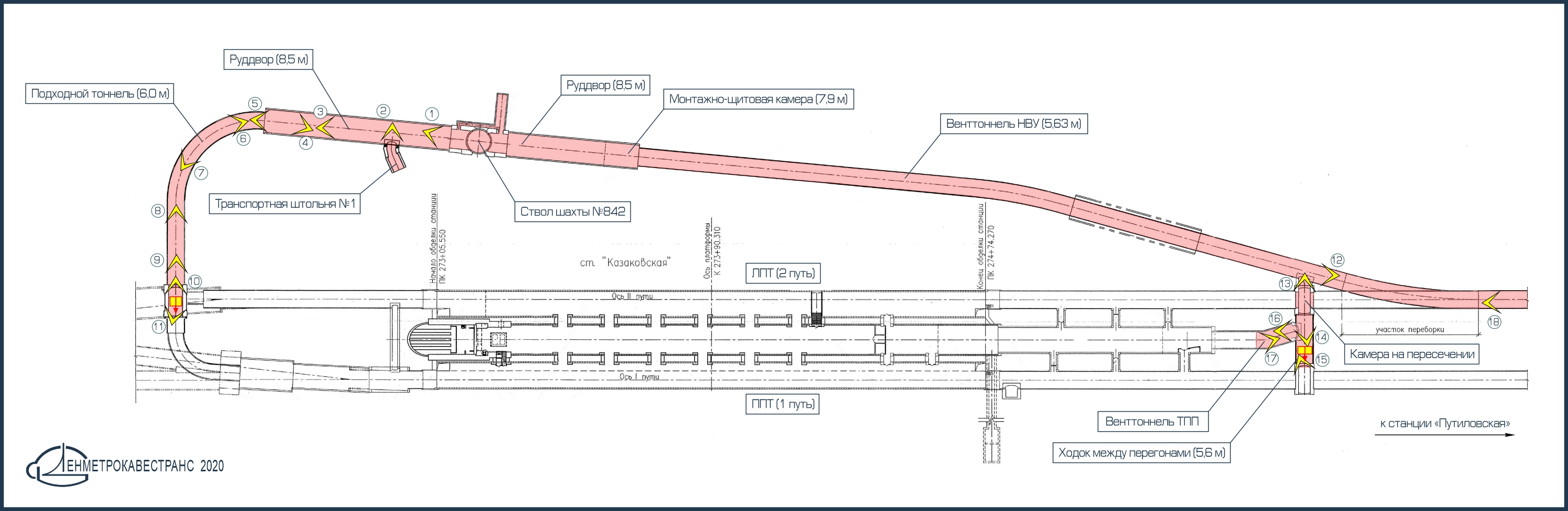 Однако, в проекте по другому. Сначала должен быть сооружен временный ходок, потом монолитная камера на пересечении с ЛПТ, затем с помощью БТУ проходится участок перегонного тоннеля в сторону ходка между перегонными тоннелями, расположенному в торце ТПП. Вот так было по проекту: